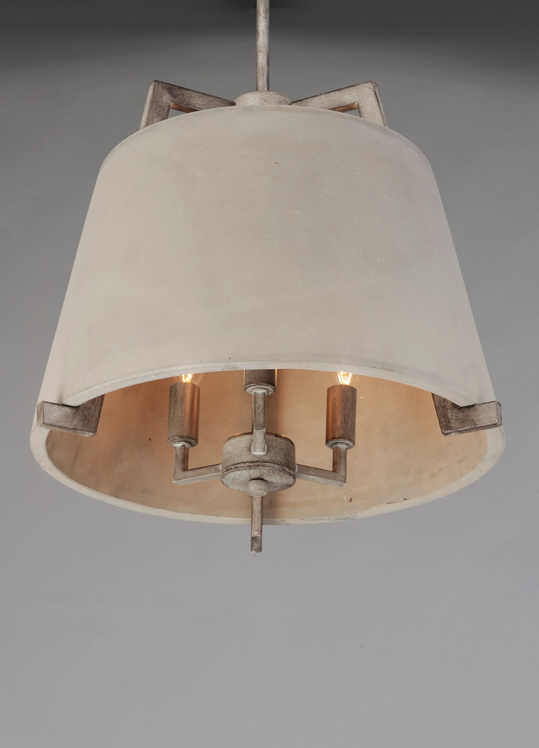 This unique pendant features a concrete shade finished which is supported on a metal frame finished in a faux-painted Driftwood. Hanging in the interior of the shade is a 3 light cluster to add a refined element to this rustic contemporary design.