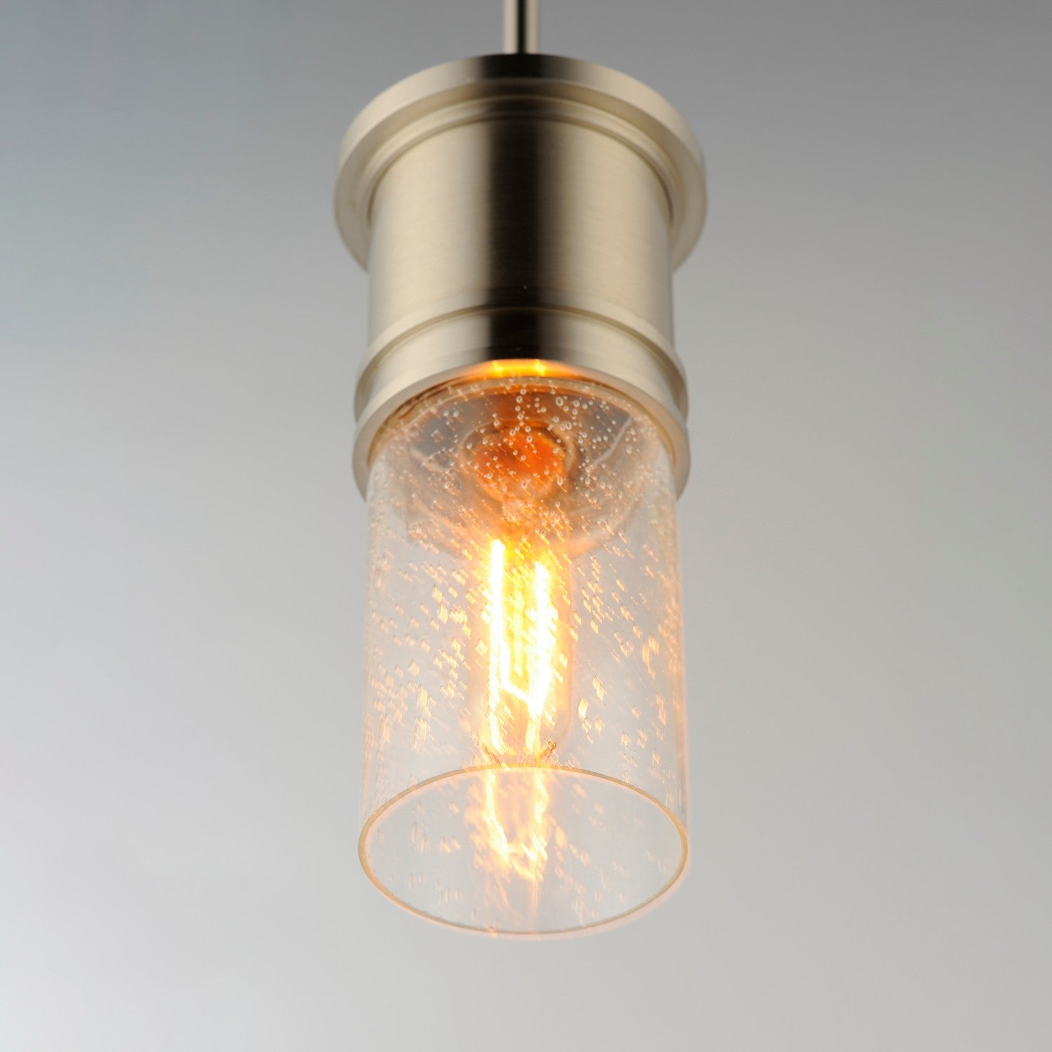Sharp lines as a cylindrical metal cup supports matching glasses in your choice of Satin White etched glass or Clear Seedy glass. A clean and transitional design, these mini pendants easily coordinate with more traditional environments with a rejuvenating young approach to design. Available in Satin Brass, Satin Nickel, or Matte Black with your choice of glass. Pair the clear glass shades with tubular filament lamps to complete the look.