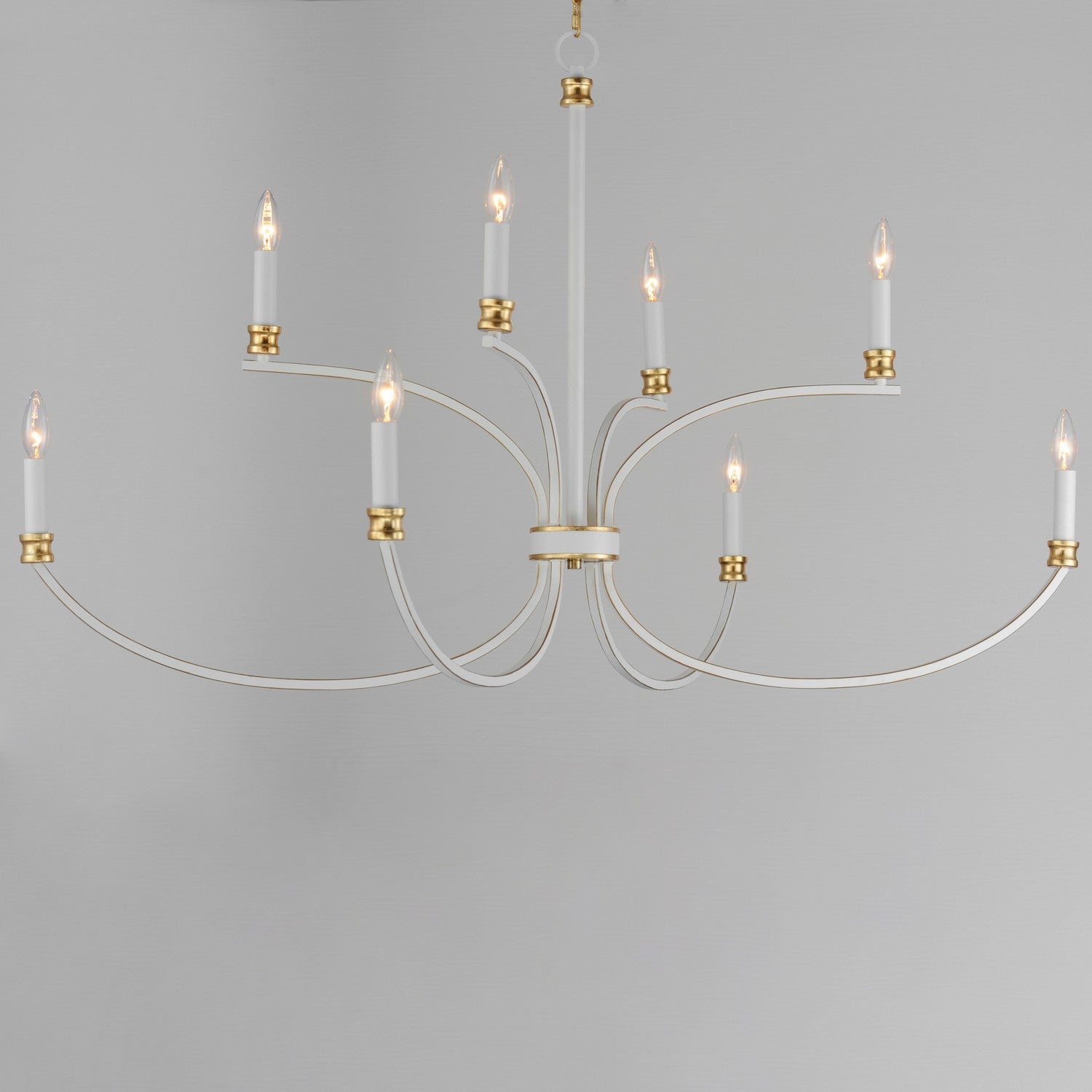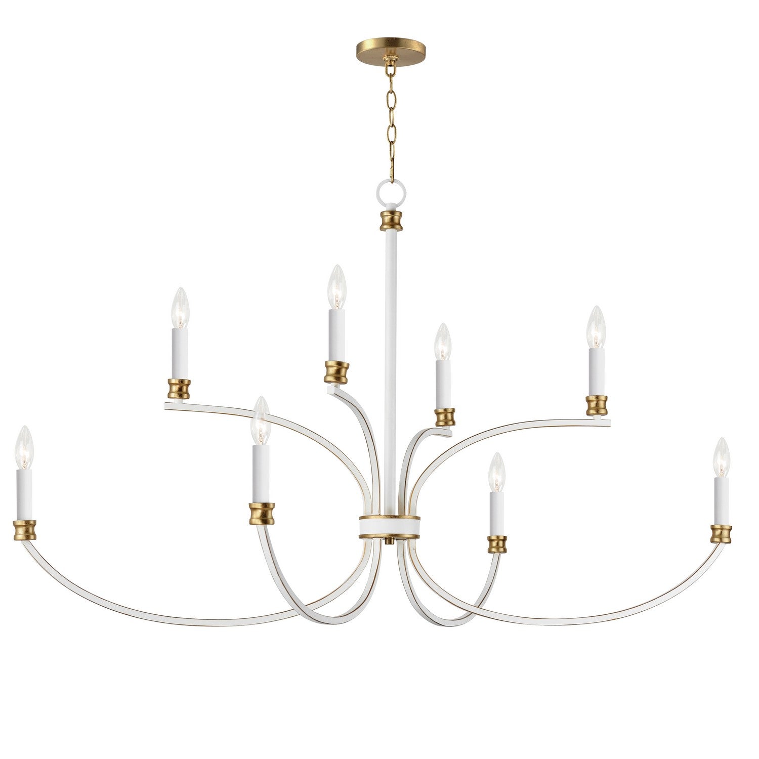 A lovely candelabra style collection with rich accents. This seemingly simple chandelier highlights classically curving accents in a stately combination of Black with Antique Brass accents or chic Weathered White with Gold Leaf accents. Taking a streamlined approach to the archetypal chandelier form, this series updates uses squared tubing to subtly modernize an approachable design with exposed candelabra lighting.