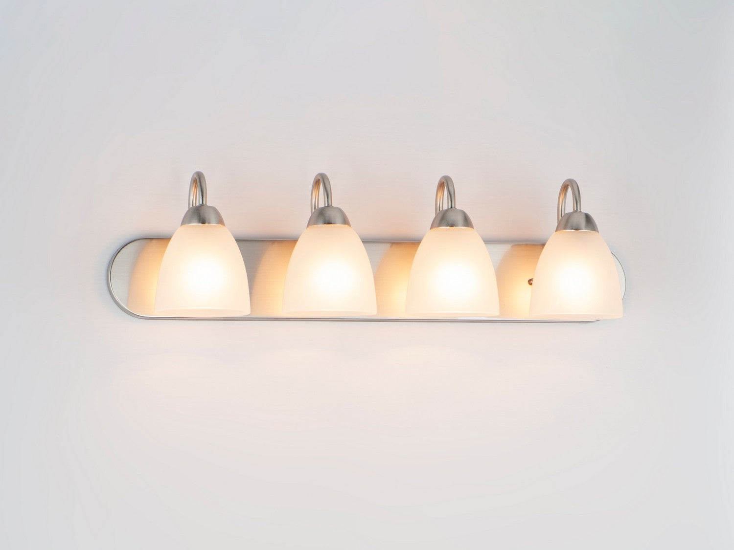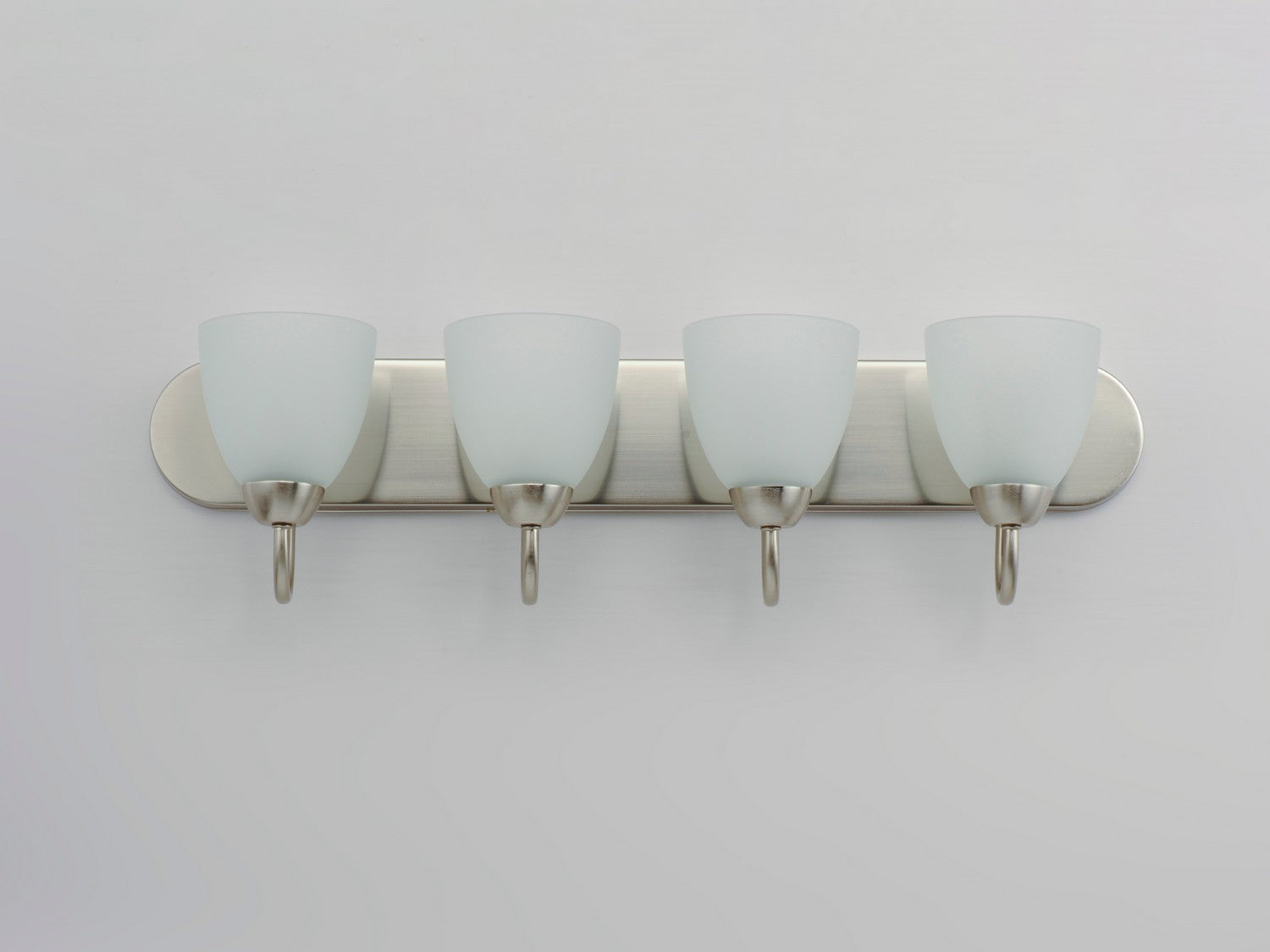 This transitional design works in any style home. Full length oval backplates support simple bell-shaped, Frosted glass shades. Available in Satin Nickel, Matte Black, and Polished Chrome.