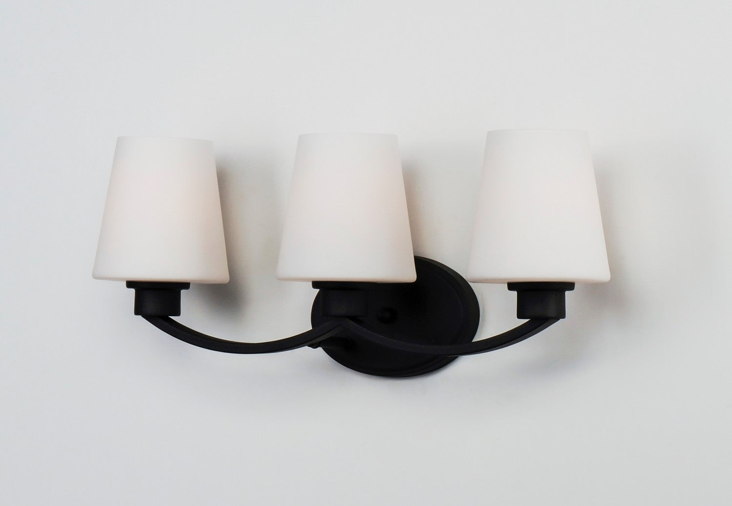 Graceful arcs of rectangular tubing transition to round cups that support tapered Satin White glass shades creating a crisp and clean transitional design. The frame is finished in your choice of Satin Nickel or Black which bridges modern and transitional design aesthetics.