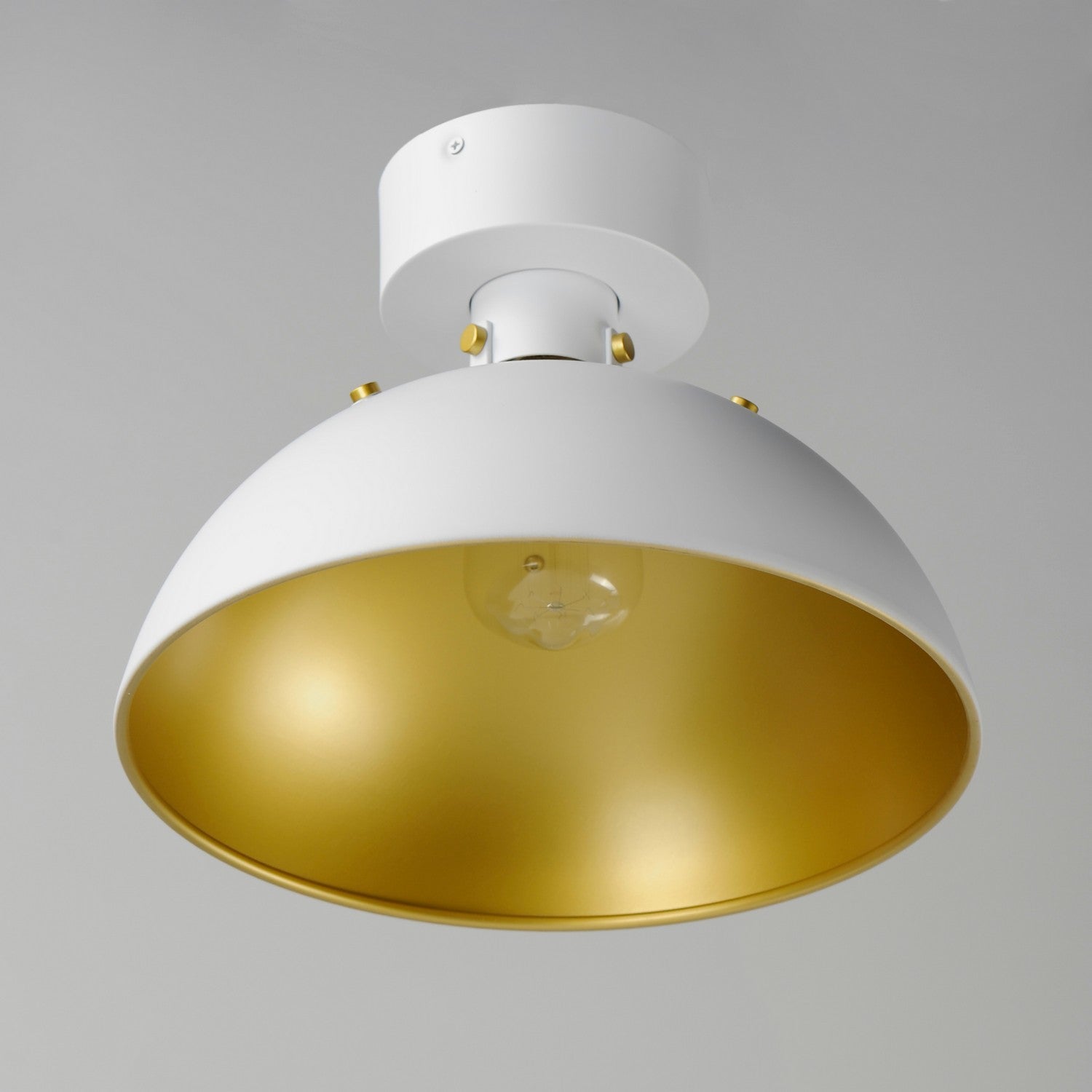 Sockets are suspended above a metal spun dome in your choice of Black or White with Gold accents or Satin Nickel with Black accents. A clean and simple approach to modern or transitional lighting, the opening allows light to shine through the opening atop while providing functional light below. This break in the two parts is supported with straps and decorative rivets in complimentary finishes for a subtlety tasteful two-tone finish. A coordinating pin-up wall sconce offers a bedside application to this design with integrated switch on its back plate and two feet of cord cover that can be removed and hardwired per your preference.