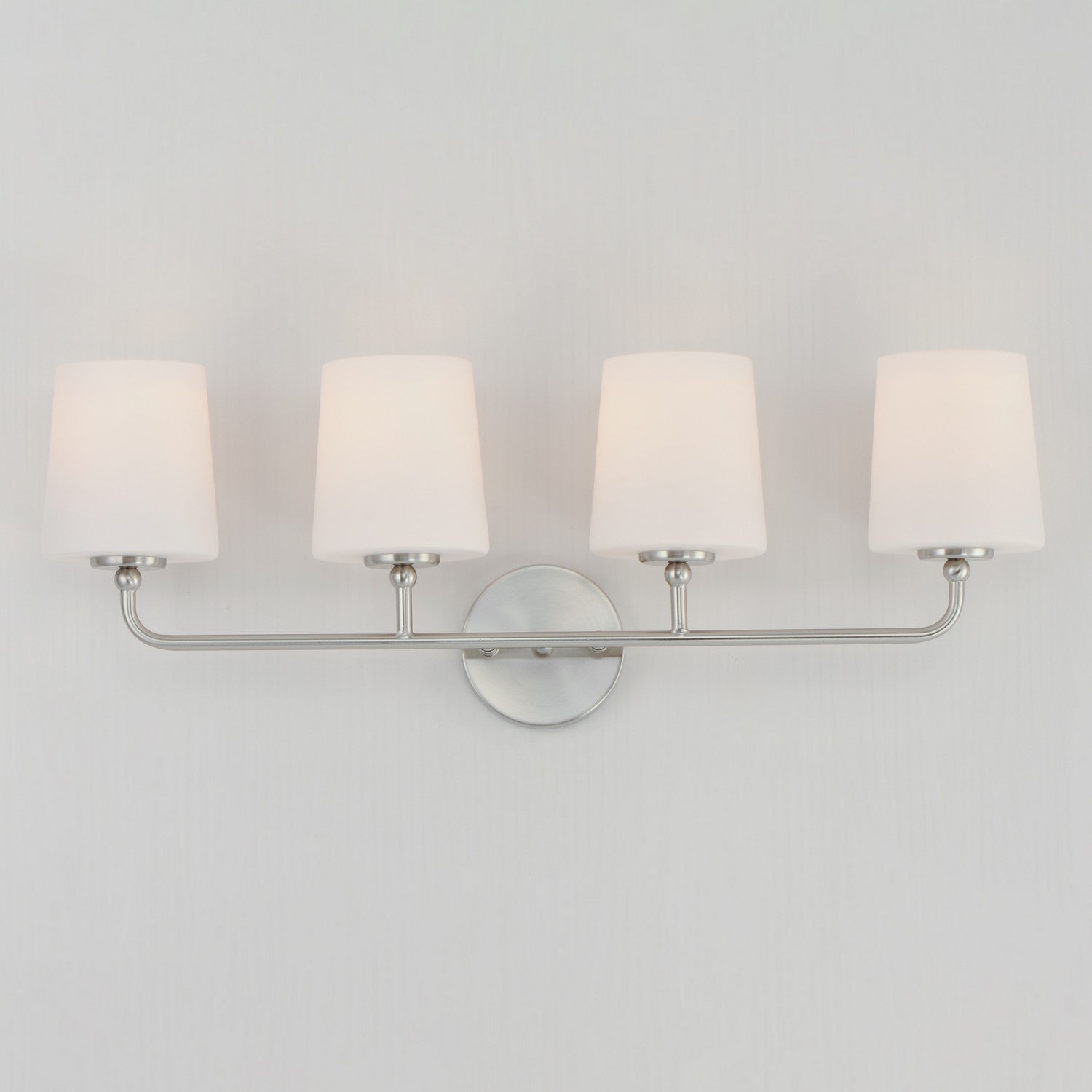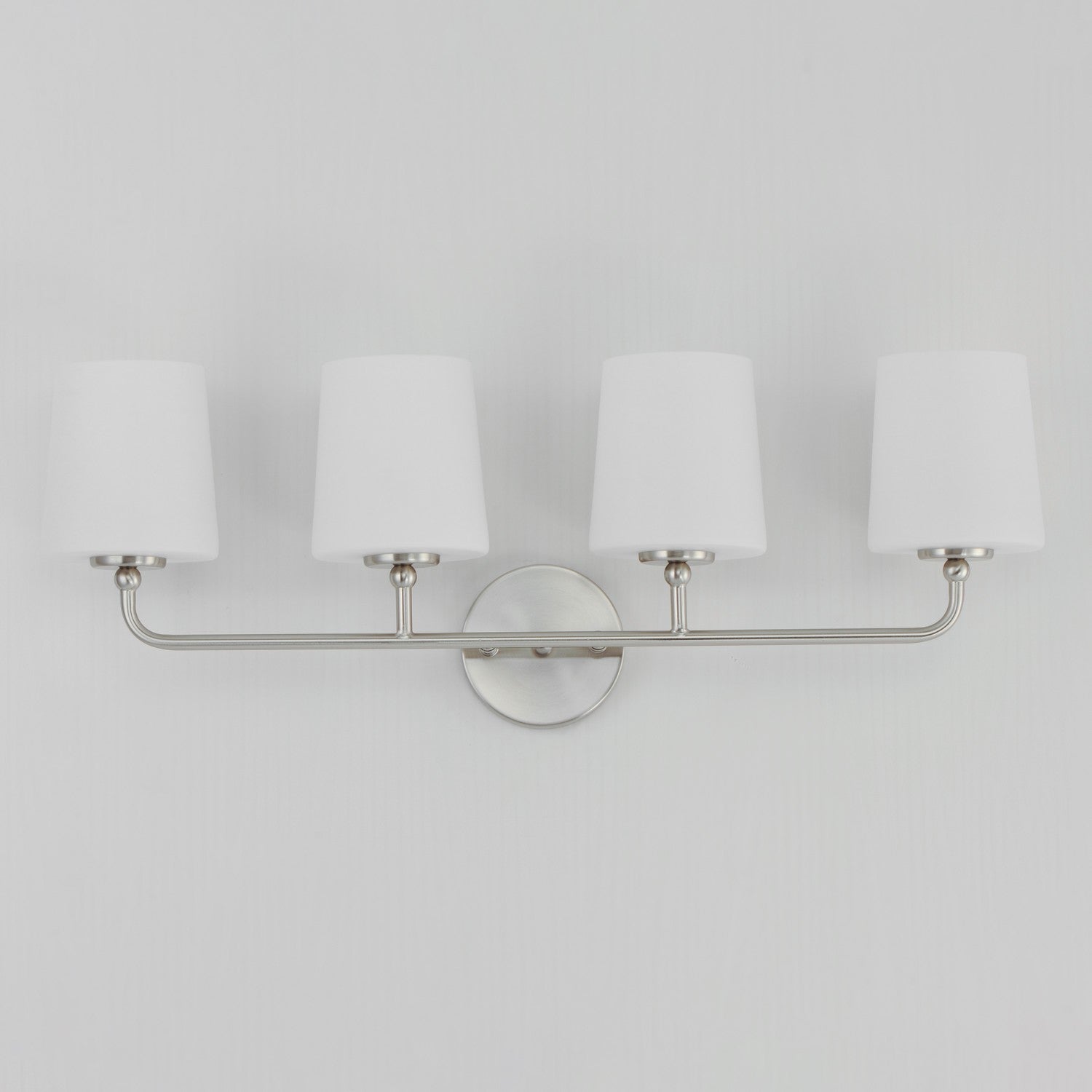 Understated elegance and convenience in its design, the simple curved arms of the Bristol collection outstretch in elongated proportions that terminate at a tapered Satin White glass shade. Designed to emulate a traditional fabric shade, the material being glass adds the element of easy maintenance and allows for upward and downward facing light installations. The single tiered wider diameters on the chandeliers also offer an upscale country living addition to the collection. Available in various finishes of Satin Nickel, Satin Brass, or black tones including a textured Anthracite finish on the chandeliers and sconces.