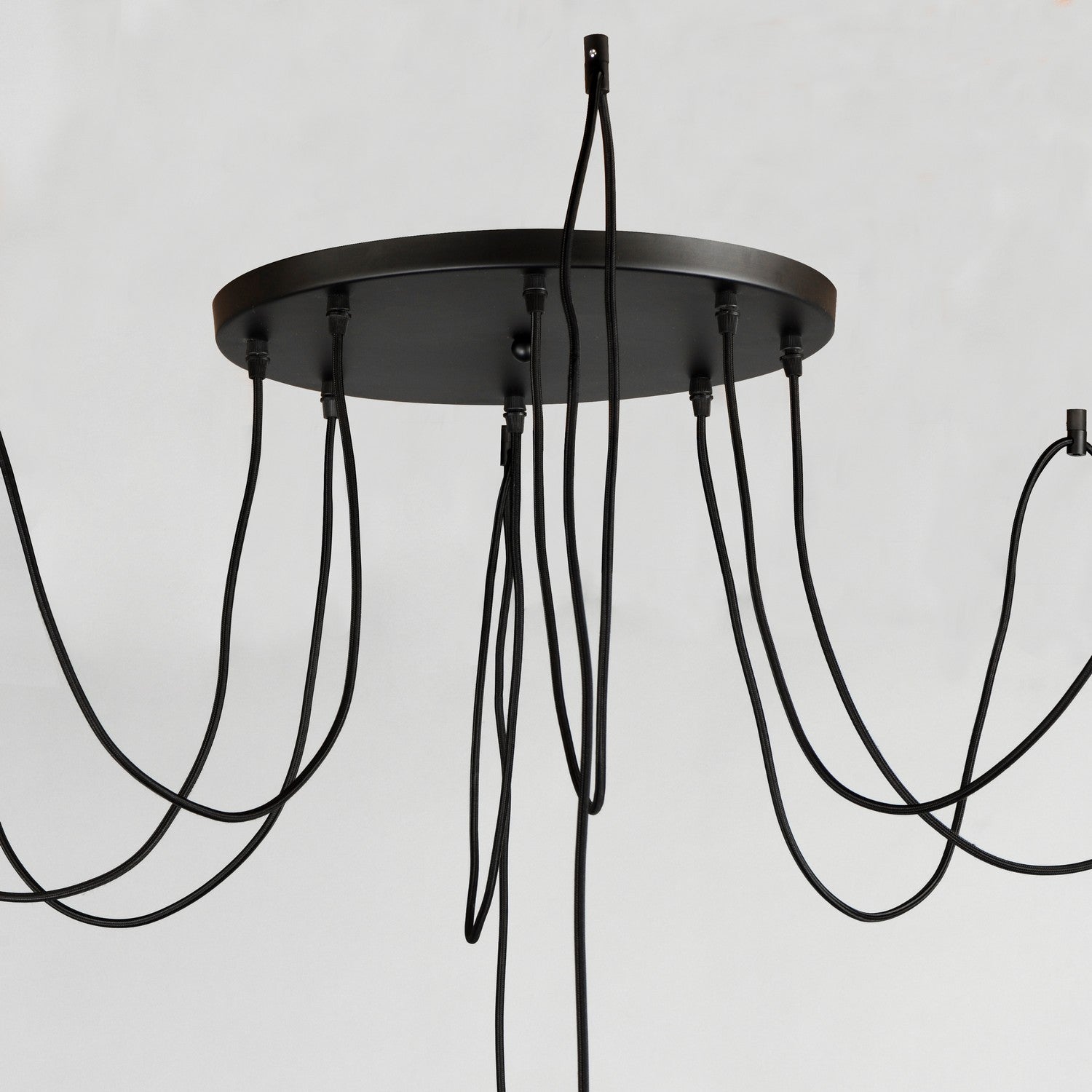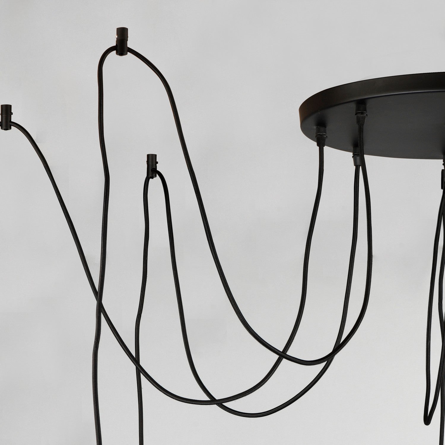 Cords of Black fabric support metal sockets finished in a natural Antique Brass allow you to create unique and fun lighting. All except the single pendant are supplied with hangers that attach to the ceiling to allow you to swag each socket. There are a number of optional bulbs to choose from.