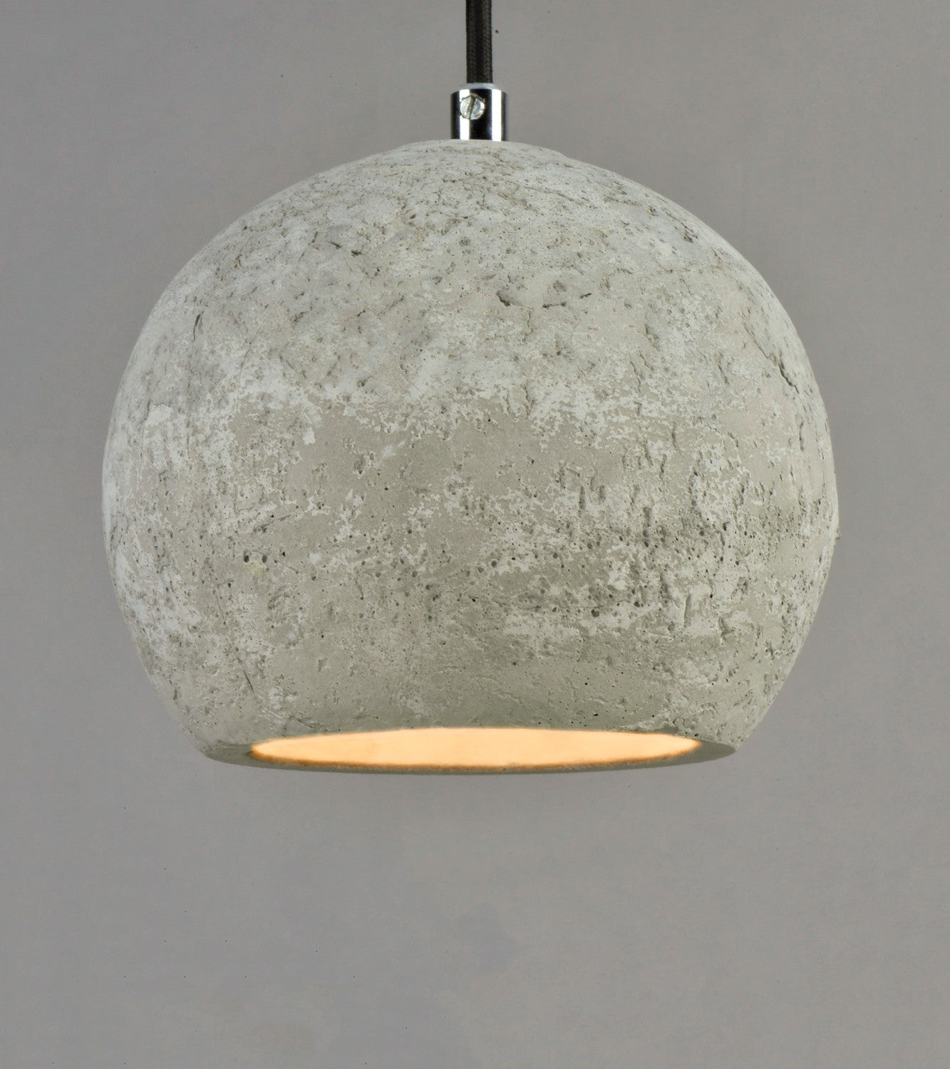 Pendants molded in natural Gray finish concrete cement provide a unique urban contemporary design element Metal Polished Chrome hardware contrasts beautifully with the black fabric covered wire. Powerful and efficient illumination is provided by included GU10, 3000K LED bulbs.