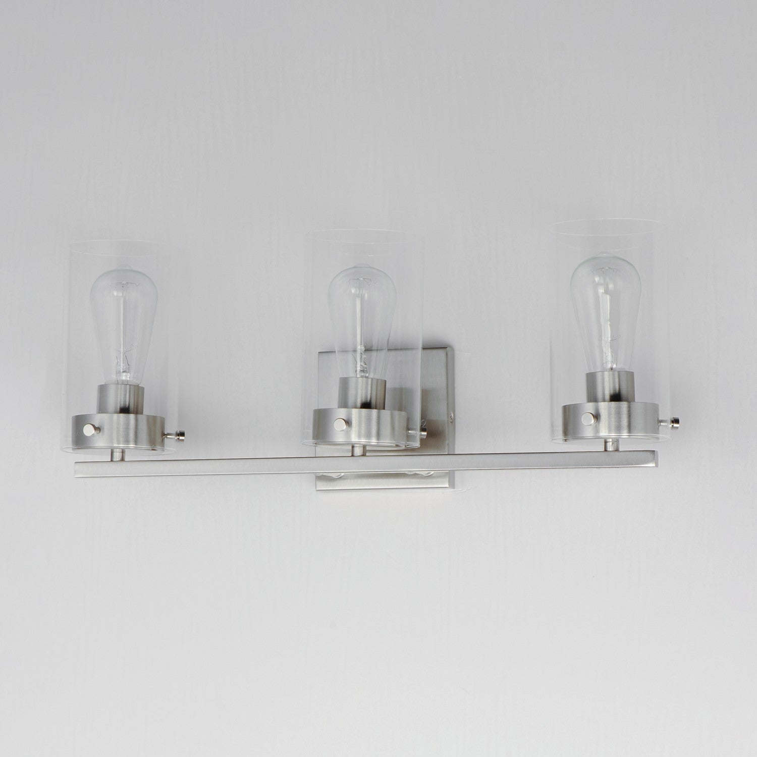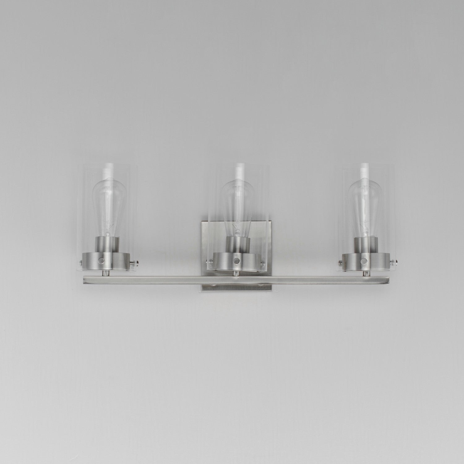 Simple clear glass cylinders are secured by decorative thumb screws in this transitional collection of sconces and pendants both neutral in design and suitable for damp applications. Choose from Satin Nickel or a two-tone Black and Satin Brass finish to pair with popular interior finishes in hardware, plumbing and decor.