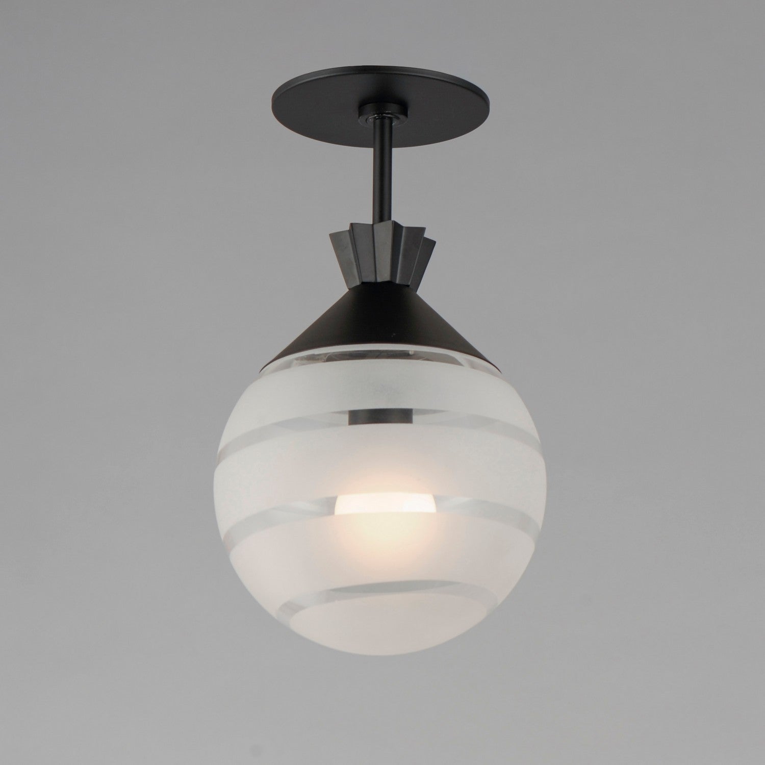 A playful grouping of globe and tapered cylinder glass shades feature a distinctive striped pattern as they are held from crown-like fonts. Spiritedly vintage and excitingly modern, this fashionable series of outdoor rated sconces and pendants connects styles generationally and with renewed imagination. The wide stripes of etched glass are separated with thinner clear glass lines softening the light source in a unique and approachable pattern. The crown tops feature sharply pleated angles that recall the iconic pineapple lanterns, but has updated them with an updated appeal. Sophisticated and full of energy, this design evokes the timeless spirit in Americana tastefully.