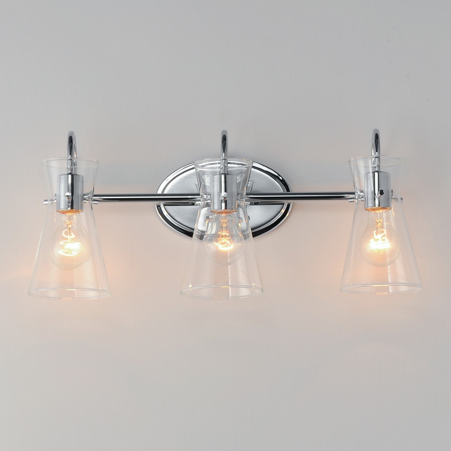 Suspended by three pin connections, the sharp silhouette of Ava's angular glass provides a designer look to enhance your bathroom design. Using Clear glass and a variety of complementary metal finishes the sconces are available in Black, Polished Chrome, or Natural Aged Brass allowing it to pair well with most interior color palettes.
