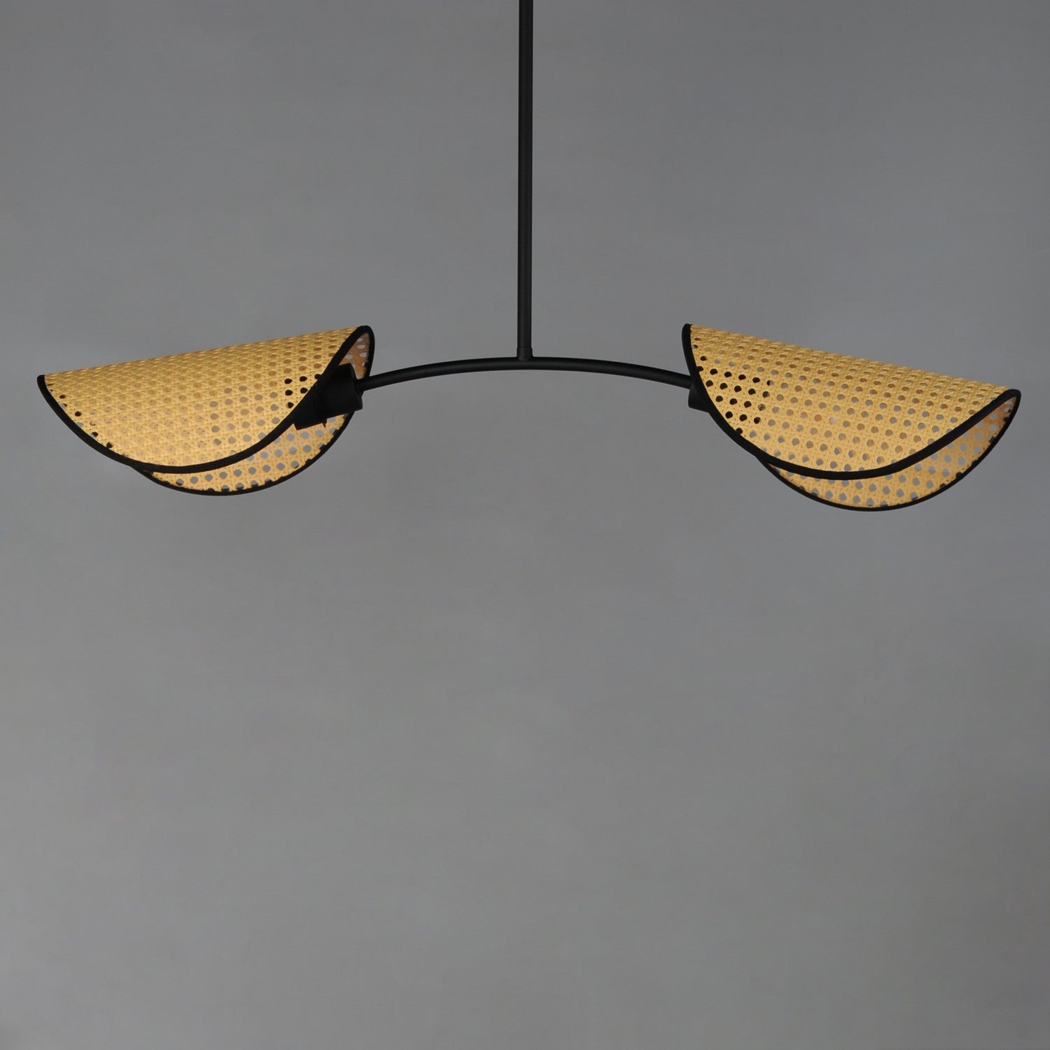 Natural cane woven wicker shades curve over exposed light bulbs like the brim of a bonnet on a minimalistic mobile chandelier. The composition of shade and chandelier shape are of a corresponding curvature. The contrast of natural materials and sandy Black silhouette of chandelier form adds nostalgia to an overall modern design. The shades are rotatable under another axis of articulation allowing more flexibility in the design according to your preference.