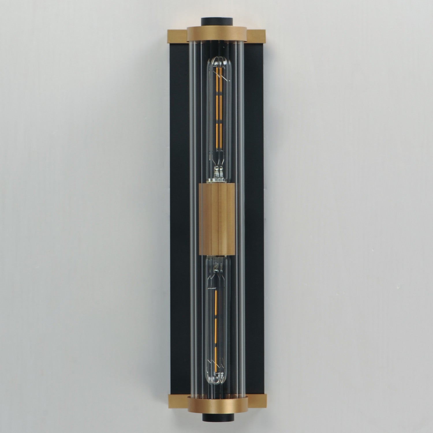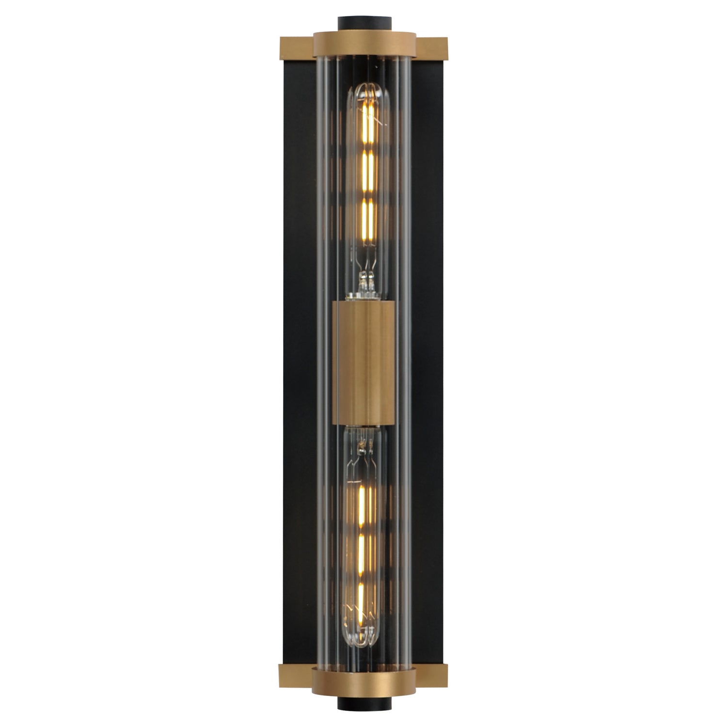 Internally ribbed clear glass tubes refract tubular lamps, creating a shimmering light effect. The glass is supported by a two-tone black frame with Aged Brass accents, making this sconce suitable for both indoor and outdoor installations. With a depth of less than 4 inches, this ADA compliant sconce may also be used in commercial applications. .