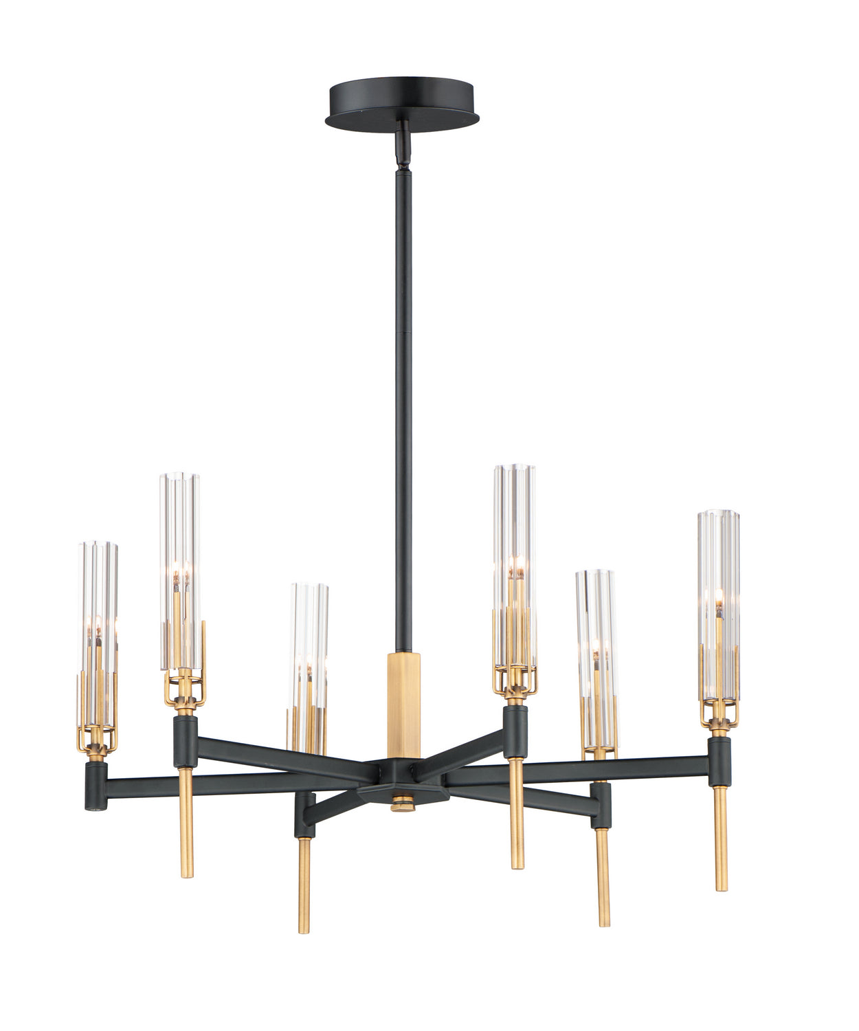 Dramatic and opulent, light sources shine through exquisite Clear scalloped glass hurricane shades as they seemingly float on unique metal prongs finished in Antique Brass. The brass accents are contrasted with a Black frame configured in cascading pendant forms, classically tiered chandeliers and elongated individual pendants. The expansive variety of configurations present a configuration for all the interior spaces of a home, be it over dining tables or used in the entry, kitchen, or over the vanity. The collection also includes ADA wall sconces that are left and right oriented for symmetrical installations bedside or beside a mirror.