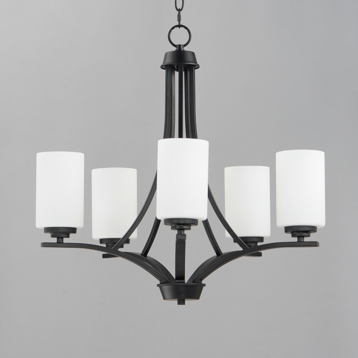 Low sloping arms of rectilinear tubing is finished in a variety of options that include Satin Nickel, Oil Rubbed Bronze, Matte Black, and a contemporary Satin Brass finish. Tall, cylindrical Satin White glass shades soften the light source within. Offered in a variety of configurations that include chandeliers, sconces, and a semi-flush pendant that may be used as a foyer pendant, has become a proven popular choice among builders.