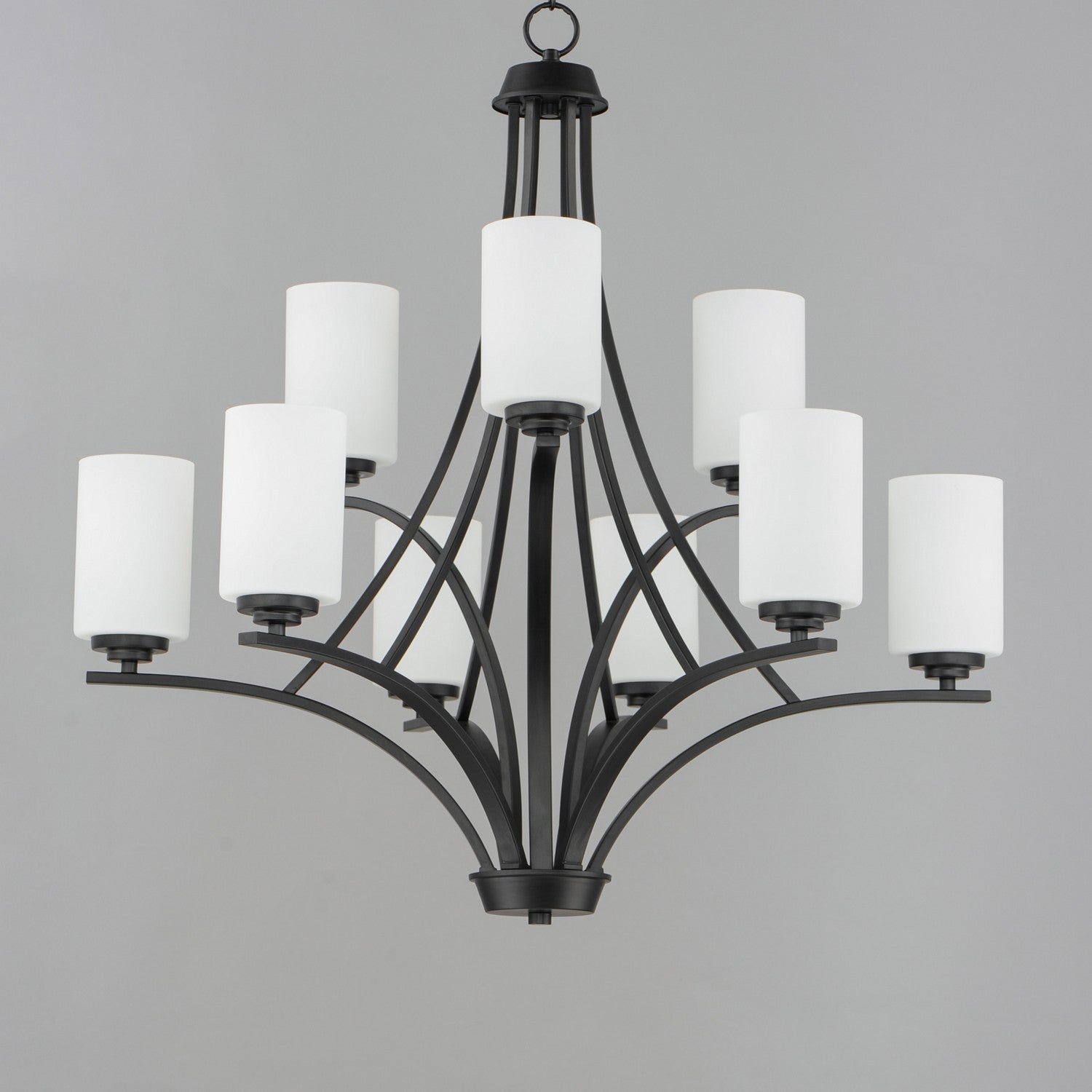 Low sloping arms of rectilinear tubing is finished in a variety of options that include Satin Nickel, Oil Rubbed Bronze, Matte Black, and a contemporary Satin Brass finish. Tall, cylindrical Satin White glass shades soften the light source within. Offered in a variety of configurations that include chandeliers, sconces, and a semi-flush pendant that may be used as a foyer pendant, has become a proven popular choice among builders.