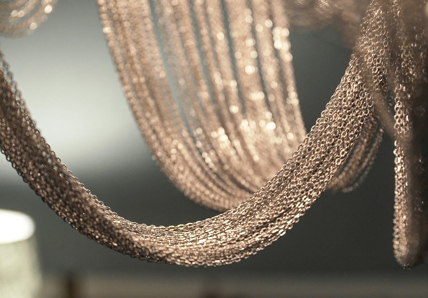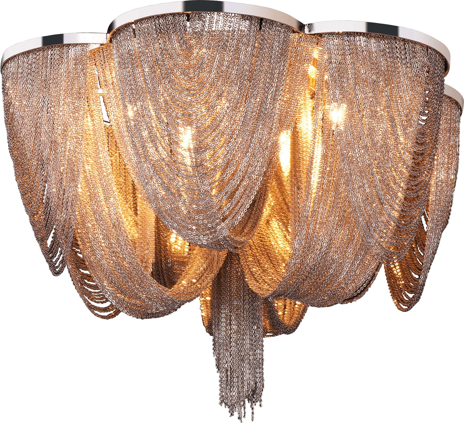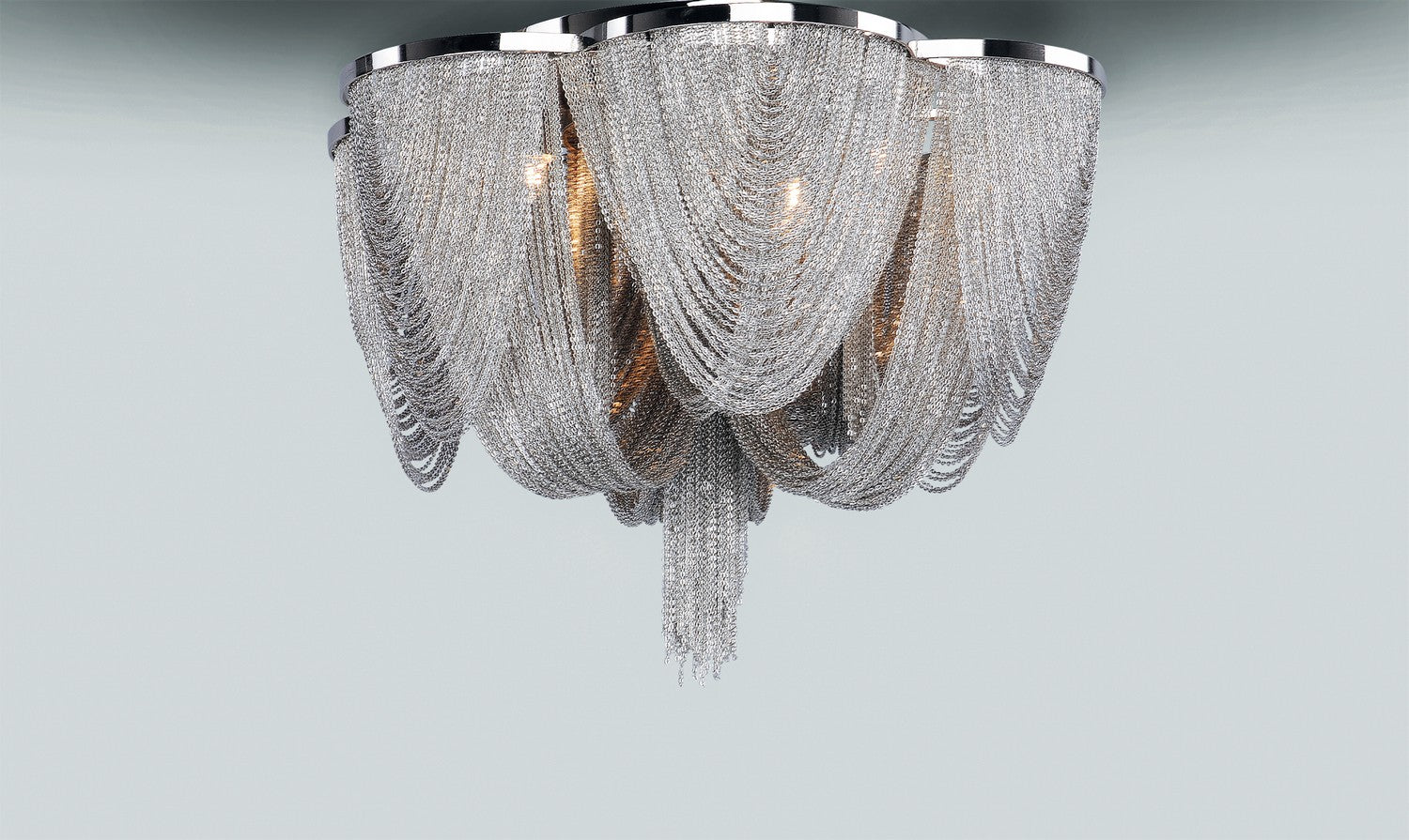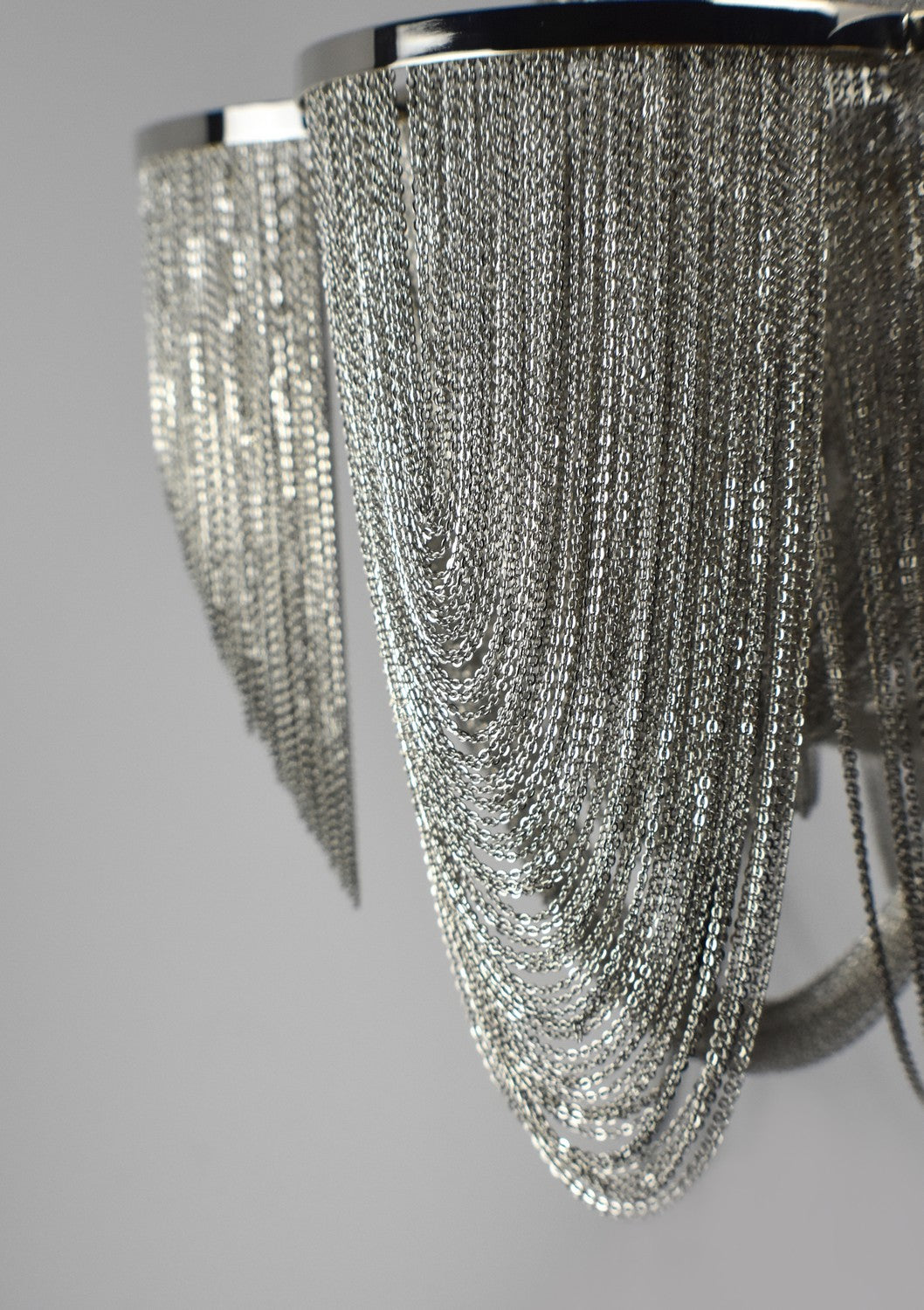 Chantilly collection features metal frames gracefully draped with Nickel finished jewelry chain. Metal trim rings of Polished Nickel add sharp contrast to the softness of the chain, which conceals the xenon light source.