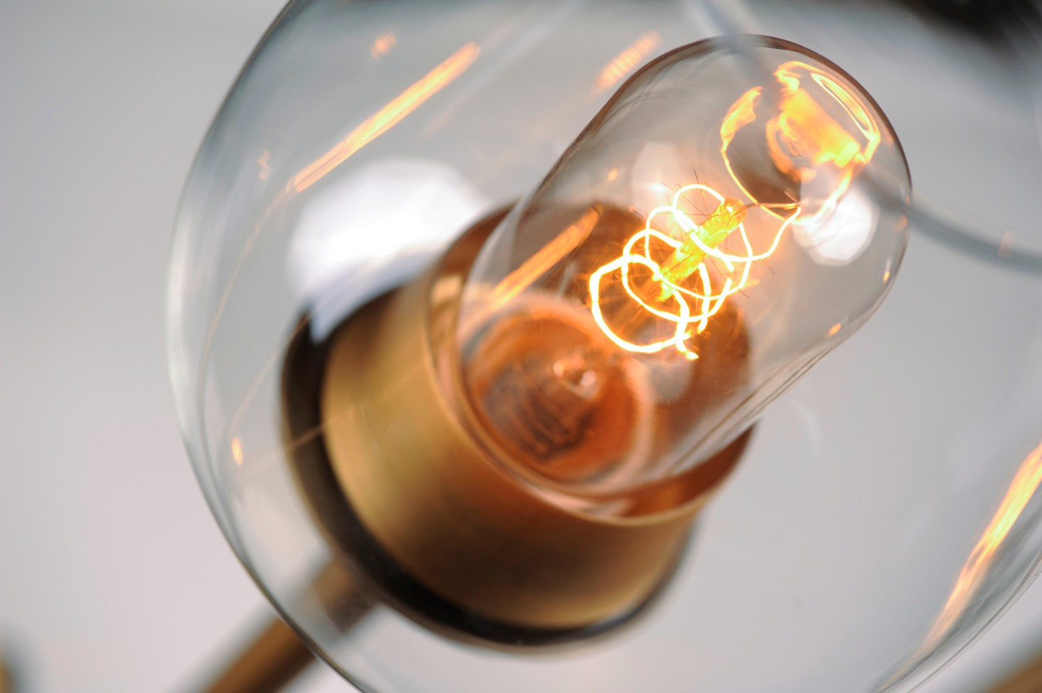 Clear glass goblets are supported by multiple arms of Black and Antique Brass originating from a center collector. This collection is made even more unique by the vintage T14 spiral filament lamps which are supplied with each fixture.
