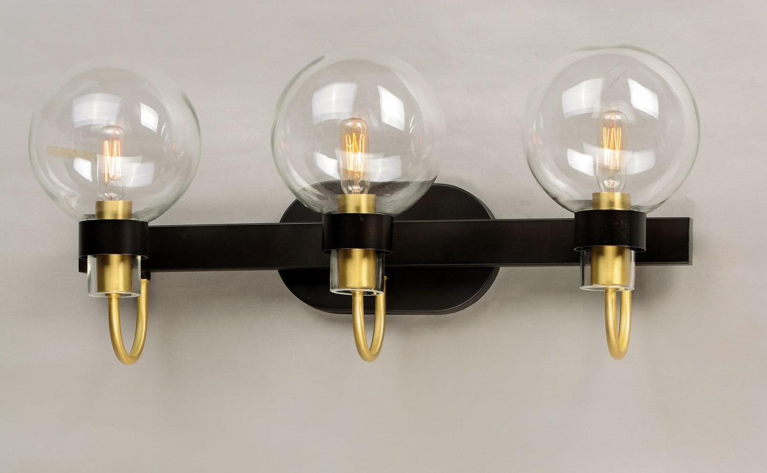 This classic Mid Century Modern design features a frame finished in a combination of Bronze and Satin Brass. The arms terminate at rings that support Clear heavy blown glass shades which were prevalent in this era.