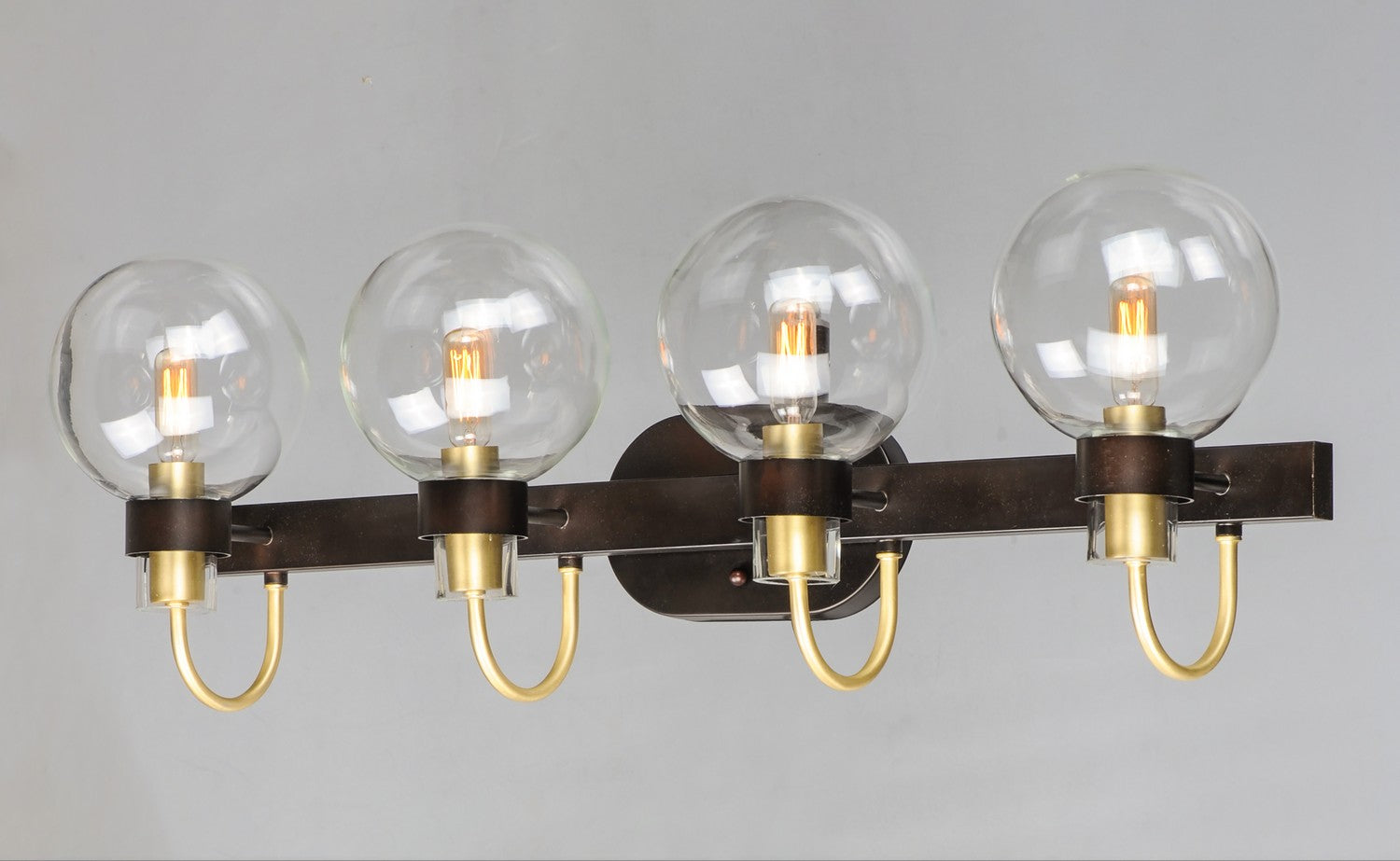 This classic Mid Century Modern design features a frame finished in a combination of Bronze and Satin Brass. The arms terminate at rings that support Clear heavy blown glass shades which were prevalent in this era.