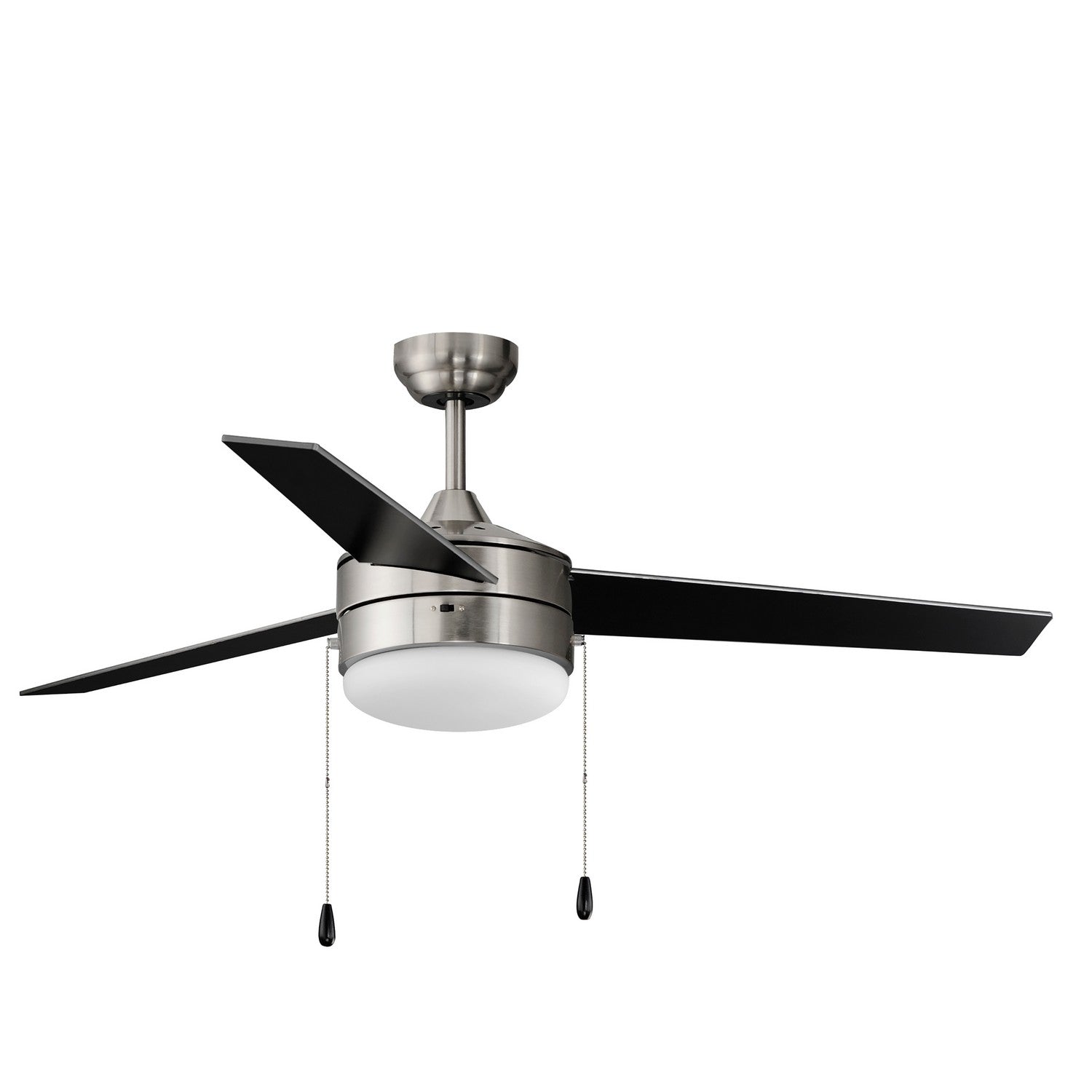 A contemporary, yet transitional look at economical pricing, the Trio fan is finished in Satin Nickel with 3 straight fan blades in Black on one side and silver on the other side. The fan is powered by an included wall control or pull chain as well as LED JA8 compliant bulbs also included.