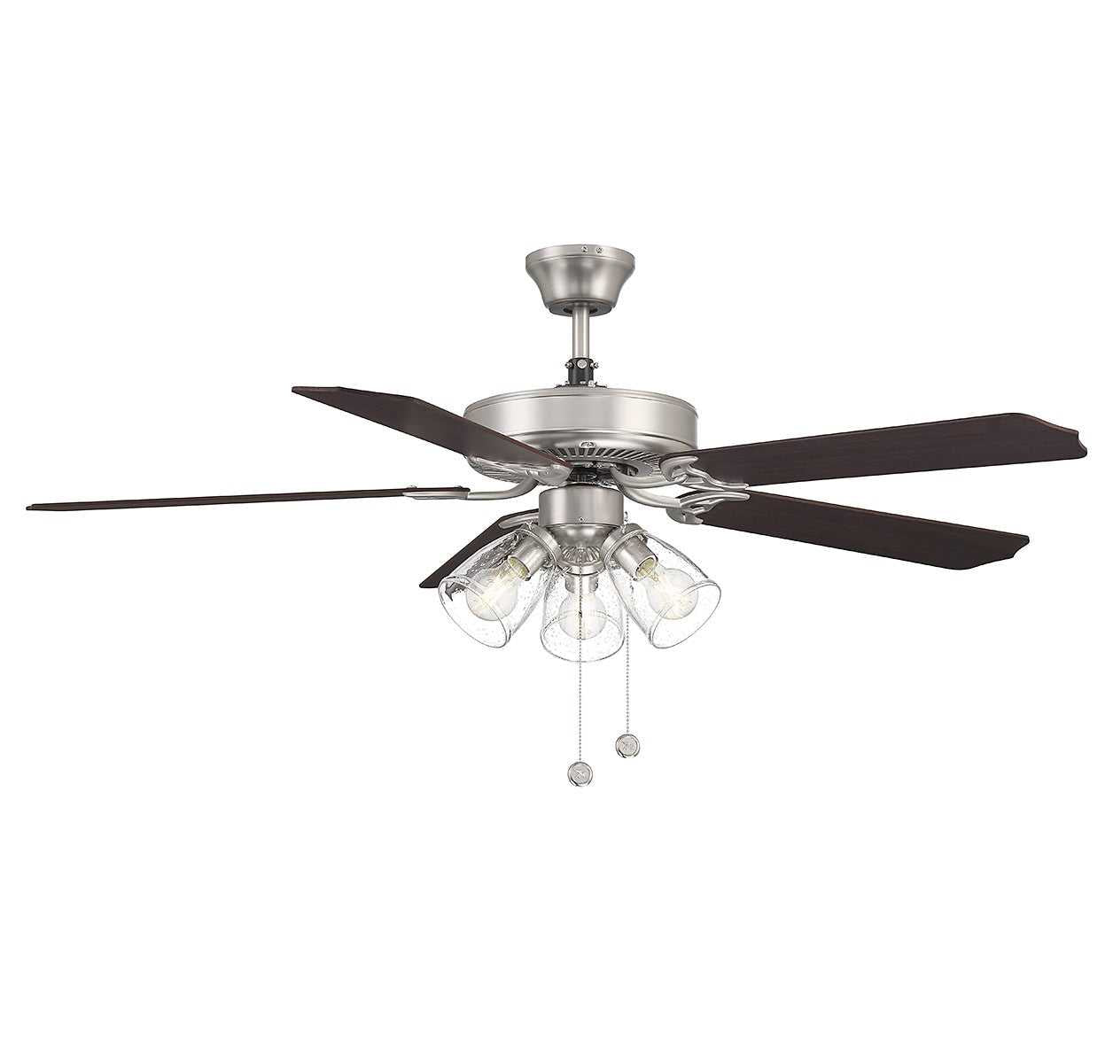 Stay comfortable while staying on budget with this 52" ceiling fan. With its brushed nickel finish and clear bubble glass shades, the adaptable style is ideal for any home! The blades are finished in walnut on one side and chestnut on the other. Two 3000K color temperature LED bulbs are included. Features a pull chain for 3-speed reversible control and a dual mounting system, with downrod and hugger, to suit most ceiling heights. Indoor use only.