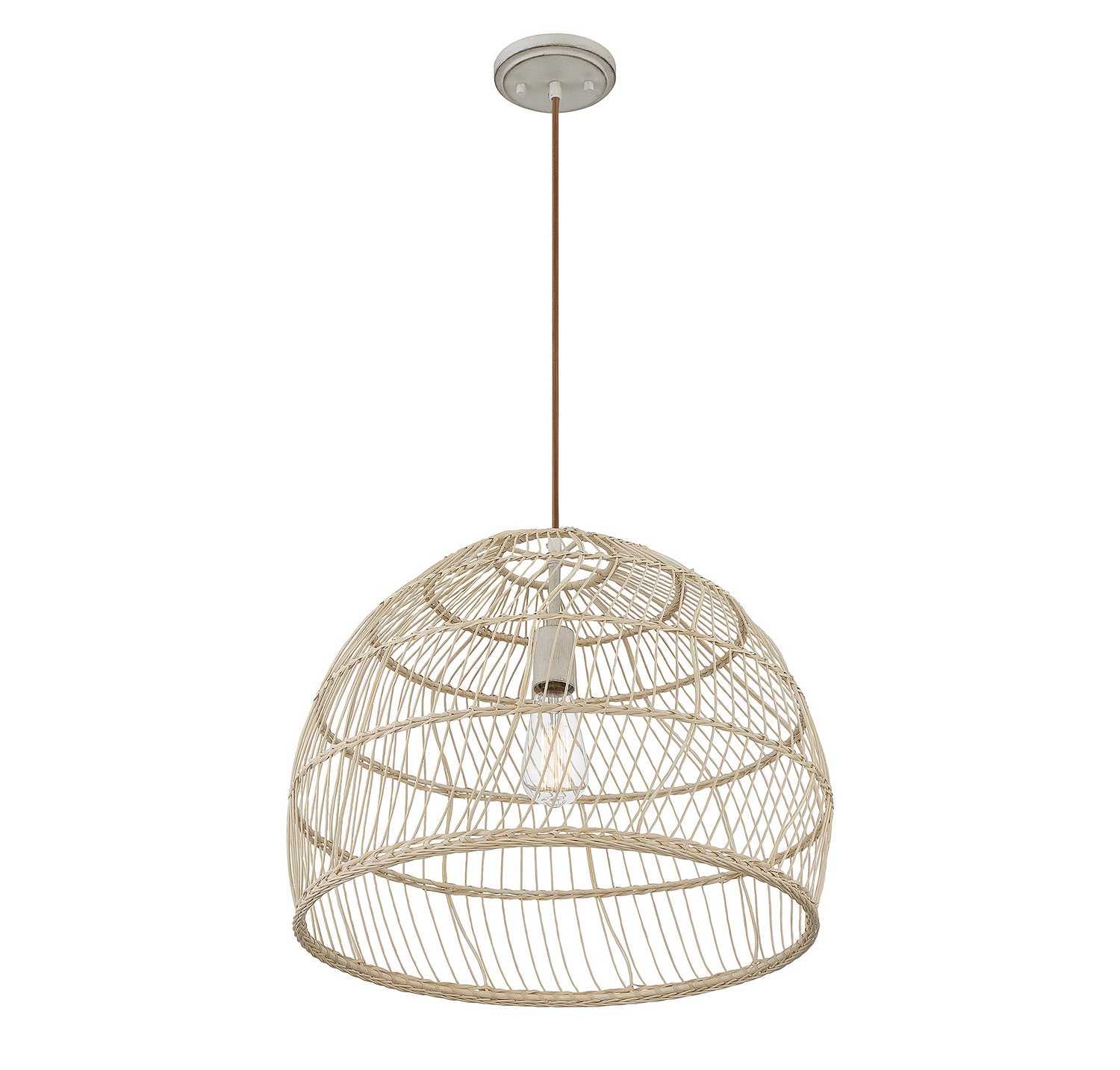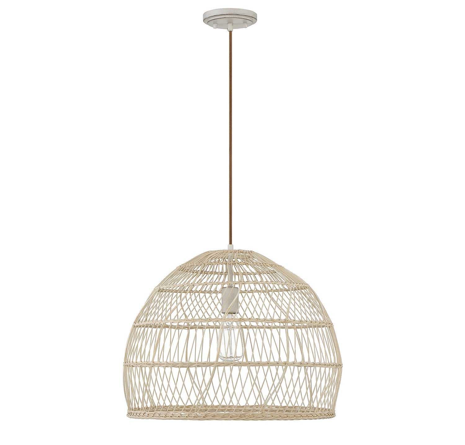 Bring a nature-inspired lighting look to your home with this 1-light pendant from Meridian. It showcases a dome-shaped, basket-inspired shade of natural rattan for an intriguing and highly textured look. The light and the matching socket shine through this shade, bringing in tone-on-tone appeal. It is great for brightening up rooms with bohemian, farmhouse and rustic decor styles. This pendant is 16" in height and 20" in width, plus it comes with 120" of cord to let you adjust the hanging height. This pendant uses 1 standard size bulb of up to 60 watts, is LED compatible and is dimmable.