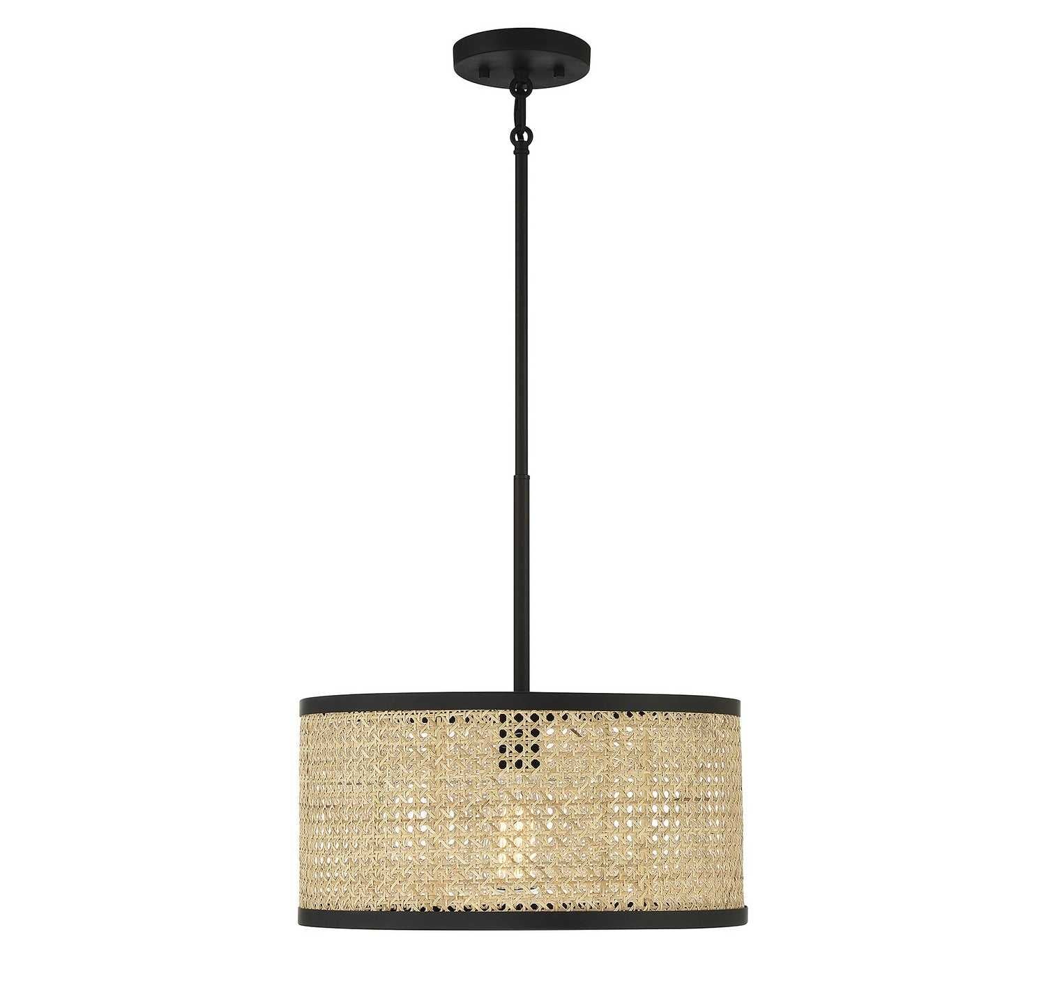 Bring in a relaxed, organic look with this stylish Meridian 1-light pendant. It features a natural cane shade with matte black edging for an eye-catching silhouette. Matte black finish. 16" height, 16" width. Max height 70". Max 60 watt bulb, standard size A19 bulb recommended. LED bulb compatible. Supplied with four 12" rods and one 6" rod.