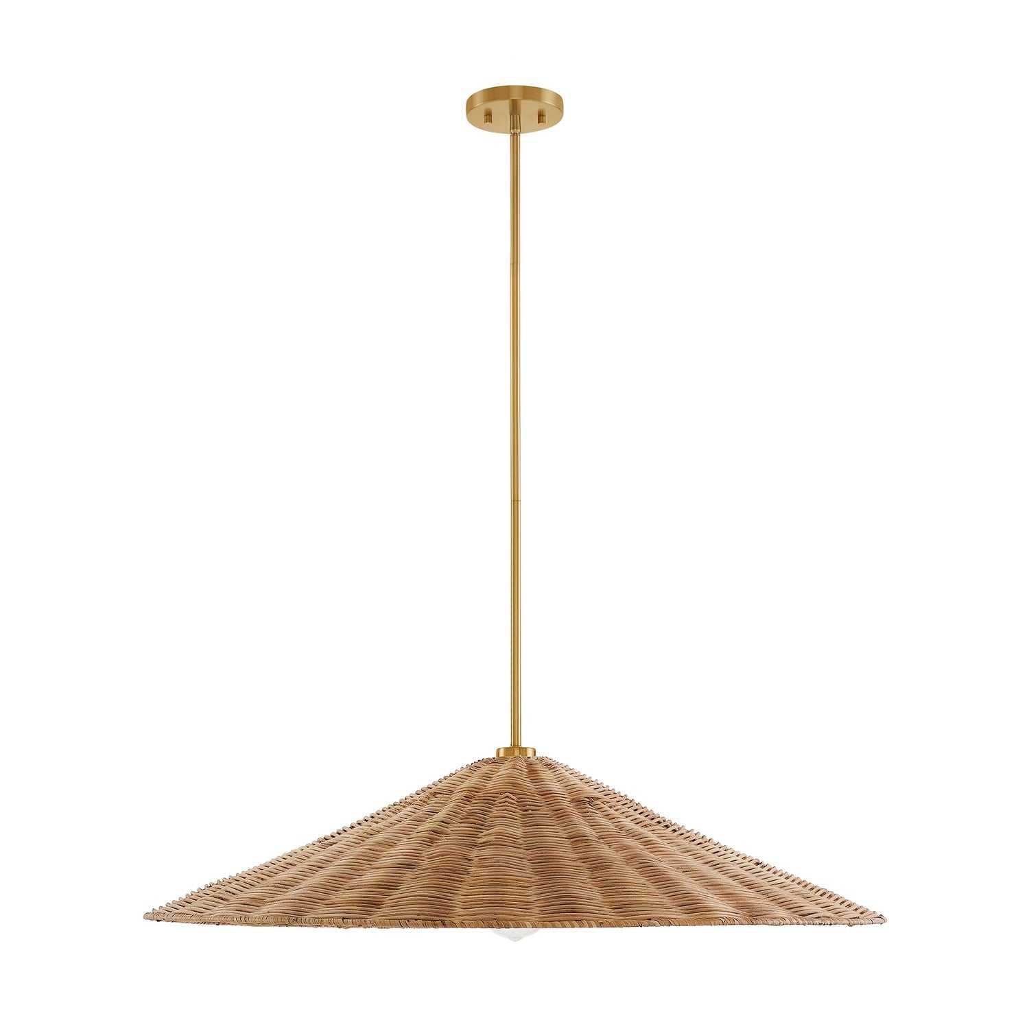 Add a relaxed, natural vibe to any room with this chic 1-light pendant. It flaunts a highly textured shade of natural rattan paired with a Natural Brass finish, bringing in a bold and fashionable flair. 8" height and 35" width. Uses one standard size bulb, max 60 watts. LED bulb compatible. Comes with four 12" downrods and one 6" downrod.