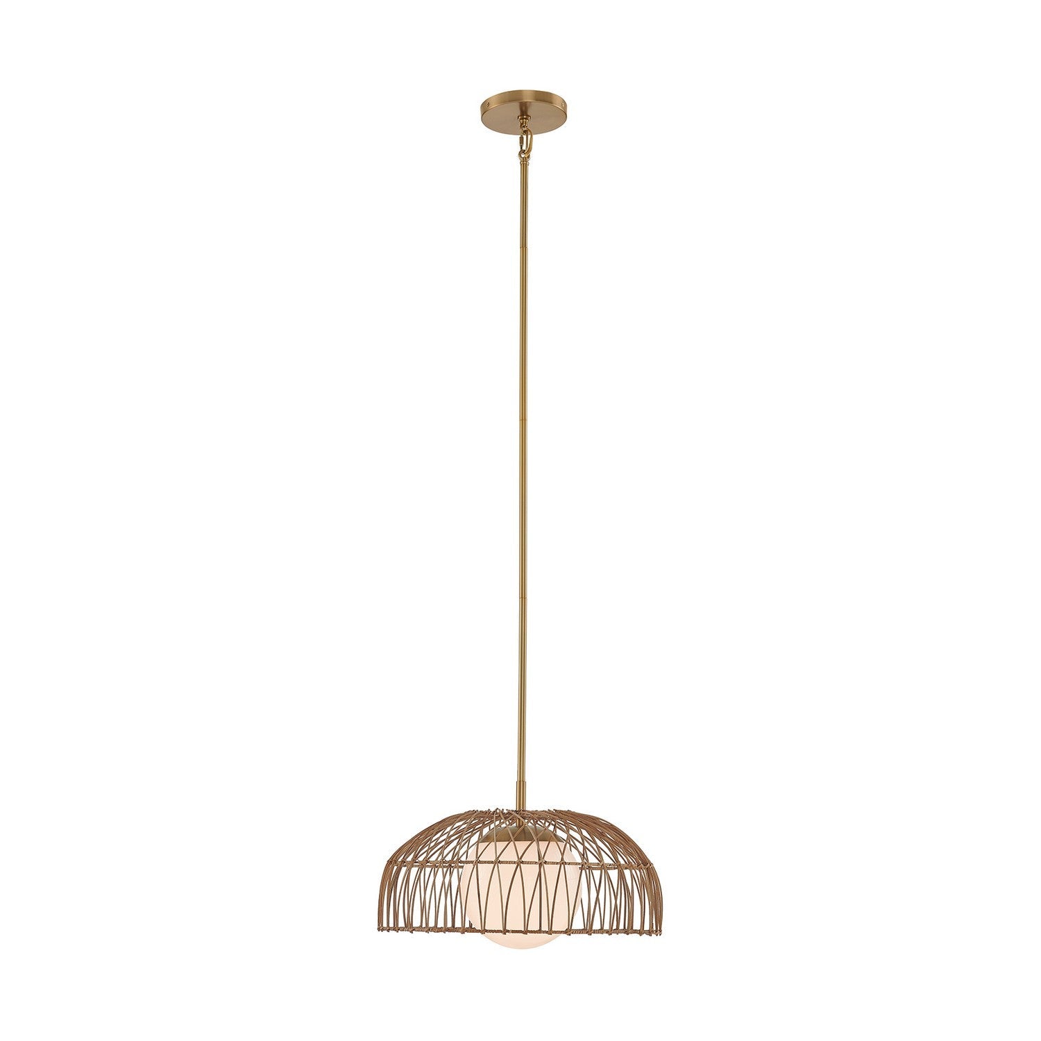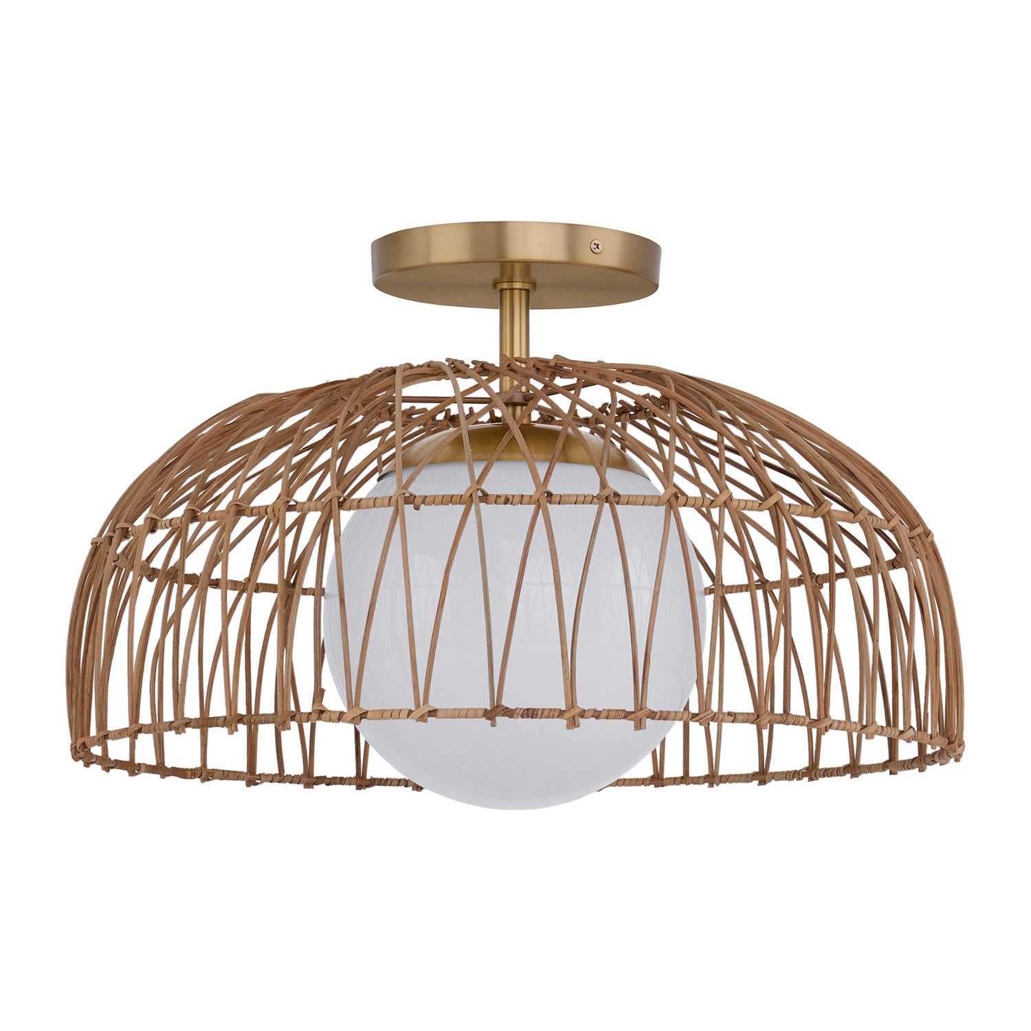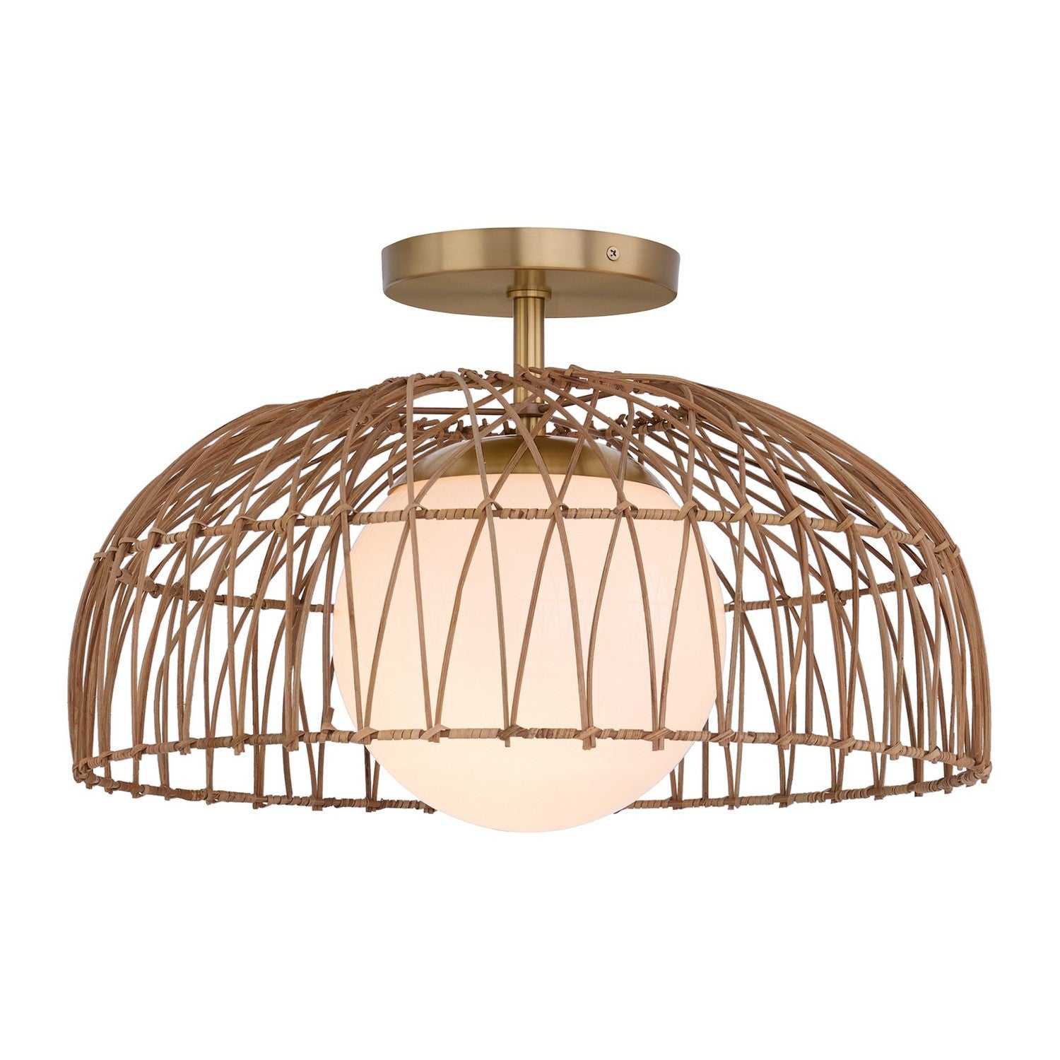 Art Deco meets organic in this beautiful 1-light ceiling light. A central orb of white etched glass is surrounded by a natural rattan shade that features an intriguing intricate pattern. The Natural Brass finish pairs nicely with these elements. This light can also be used as a hanging pendant! 12" height and 18" width. Uses one standard size bulb, max 60 watts. LED bulb compatible. Comes with four 12" downrods and one 6" downrod.