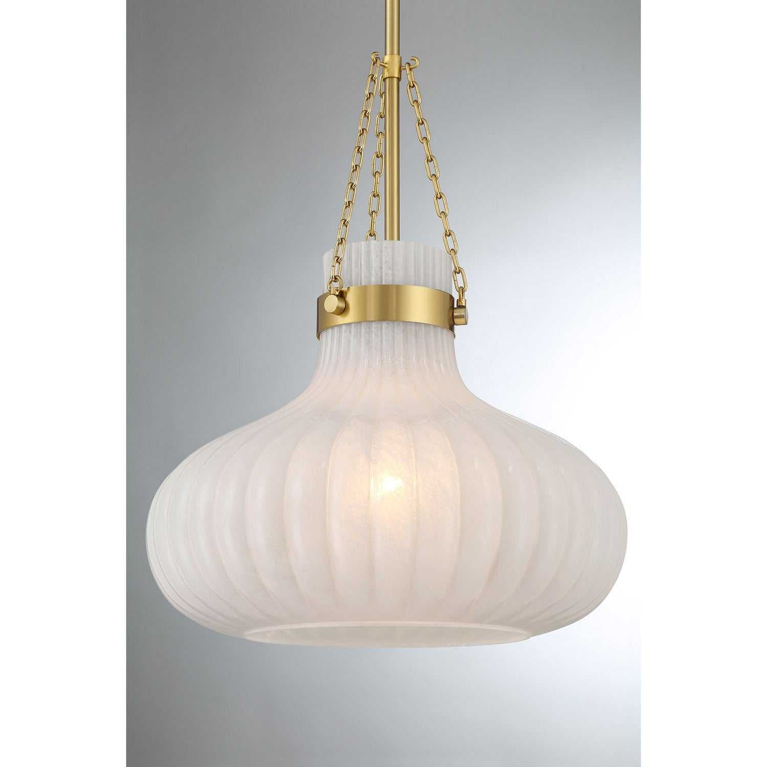 Traditional style lighting is given an ethereal upgrade in this beautiful 1-light pendant. Its fluted ribbed glass shade is made from strie glass featuring dazzling swirls that draw the eye, soften the glow and work beautifully with the Natural Brass finish. This pendant is 15" in width and has an adjustable height ranging from 19" to 73". Comes with four 12" downrods and one 6" downrod. Uses one standard size bulb of up to 60 watts. Bulb not included.