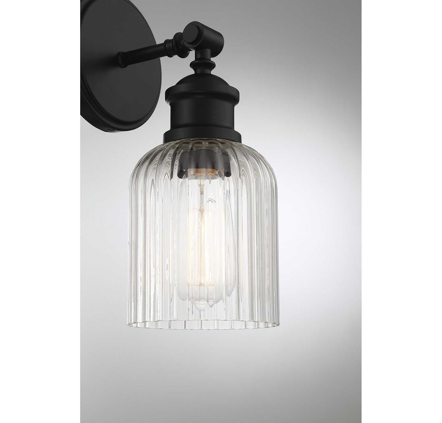 A clear ribbed glass shade adds texture and intrigue to this vintage-inspired Meridian 1-light wall sconce, which is finished in matte black. Perfect when used solo or in groupings. 12" height, 5" width, extends 6.75" from the wall. Max 60 watt bulb, standard size A19 bulb recommended. LED bulb compatible. Damp area rated.