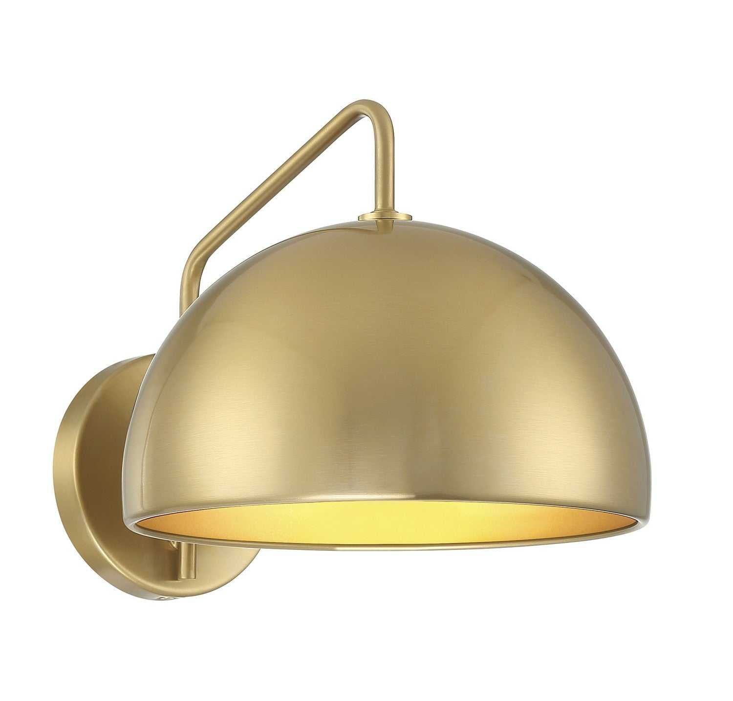 Bring contemporary style to any space with this 1-light sconce. It features a solid metal shade, eye-catching detailing and a natural brass finish. 8.5" height, 10" width. Uses standard size bulb, max 60 watts. LED bulb compatible.
