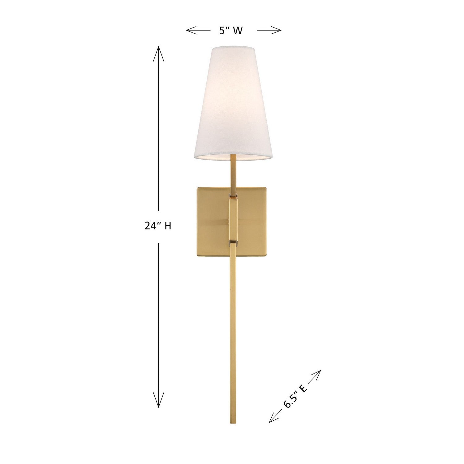If you want to add a touch of chic, classic style to any room, look no further than this 1-light sconce. Finished in Natural Brass, pairing a pencil-sleek body with a bold square backplate and a white linen fabric shade, it is great whether used solo or in groupings. This sconce is 24" in height, 5" in width and extends 6.5" from the wall. It uses 1 candelabra size bulb of up to 60 watts. Bulb not included.