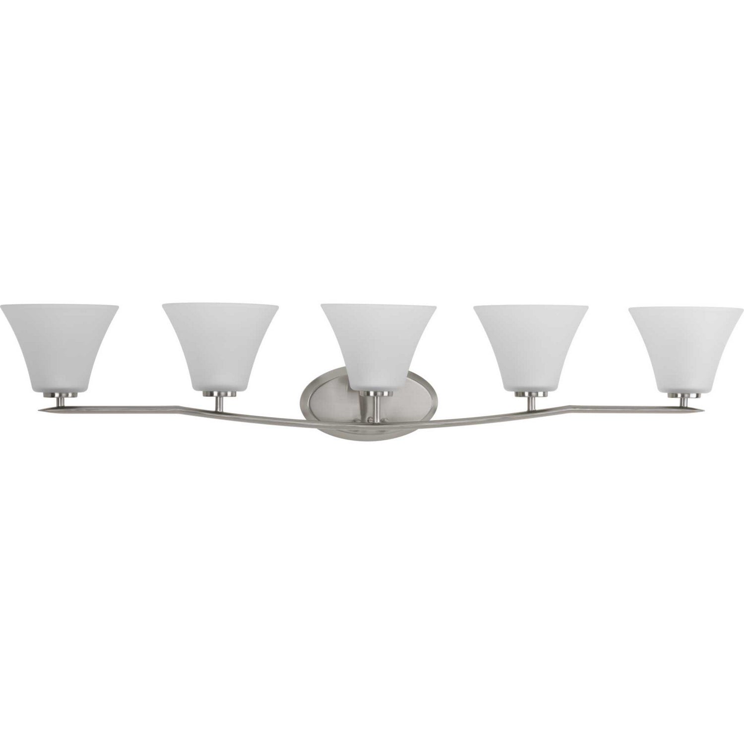 Five-light bath finished in Brushed Nickel with etched glass shades scaled across a slightly arching, pointed arm. Generously balanced glass shades add distinction and provide pleasing illumination to your room. Coordinating fixtures from this collection let you decorate an entire home with confidence and style.