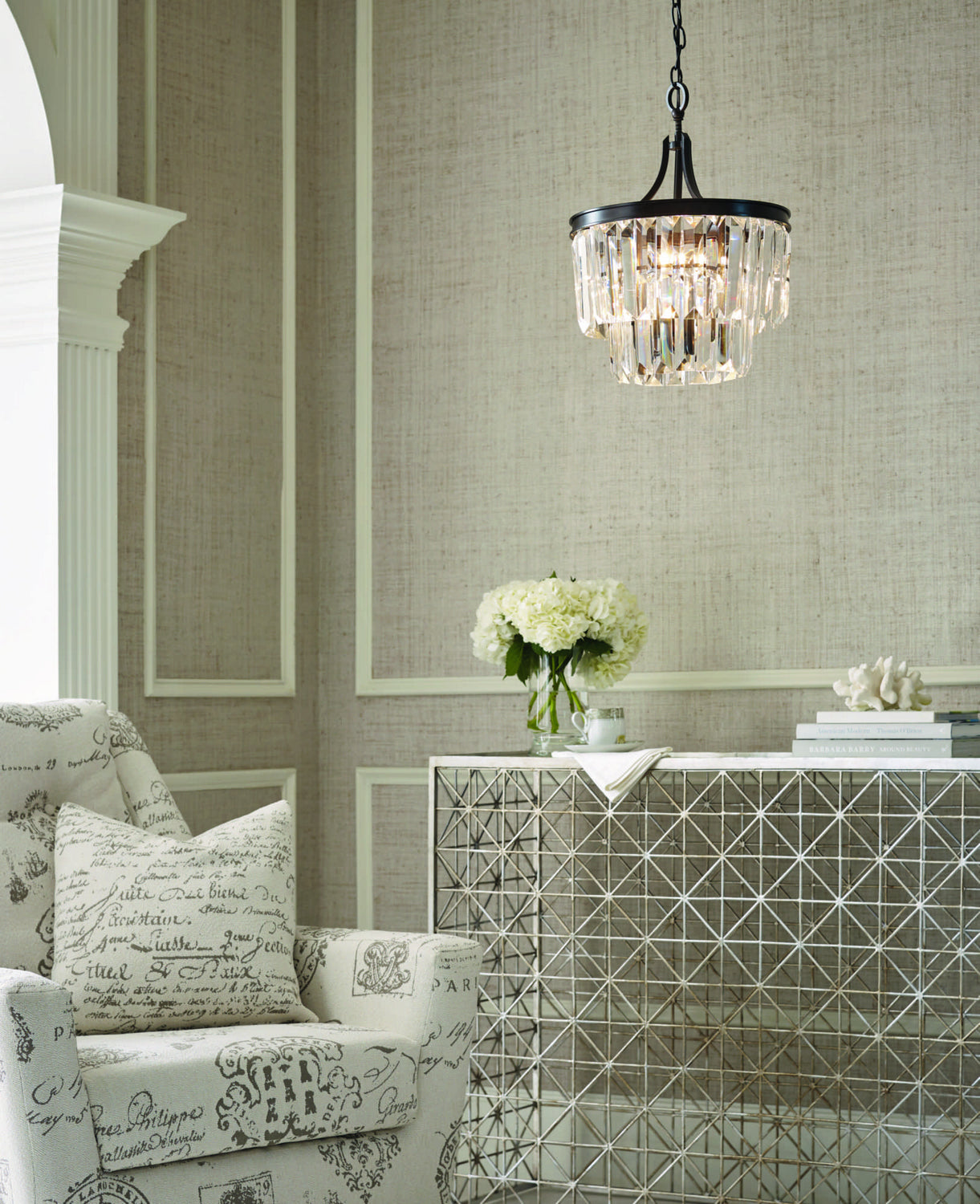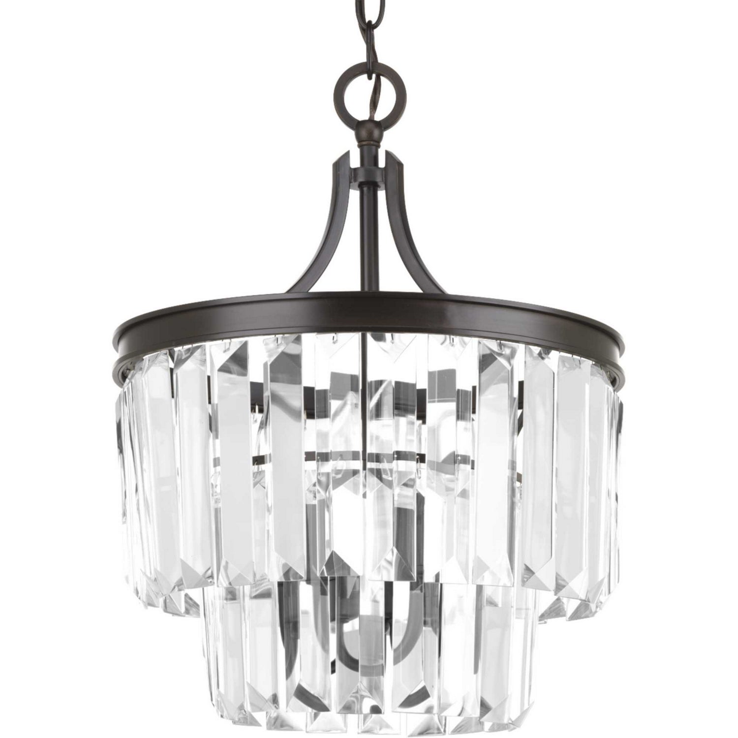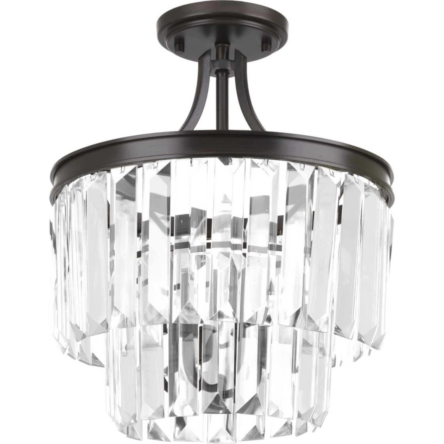 Glimmer fits the definition of livable luxury with elements that sparkle to create an instant statement within the home. Prismatic glass three-light pendants are supported by an architecturally- styled frame in Antique Bronze finish. The cascade of faceted linear glass deliver a sleek silhouette to any room. This versatile fixture can also be mounted as a semi-flush.