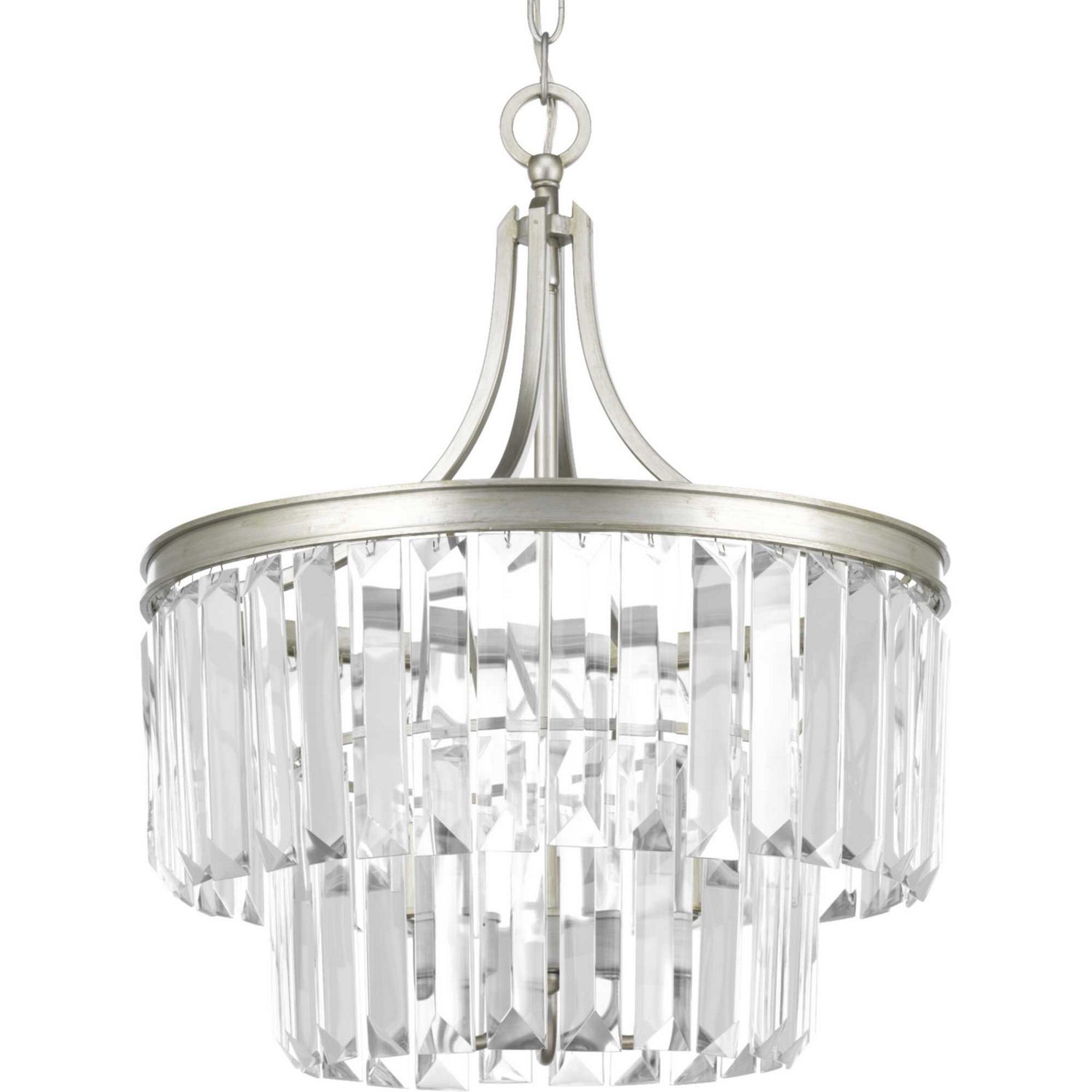 Glimmer fits the definition of livable luxury with elements that sparkle to create an instant statement within the home. Prismatic glass three-light pendants are supported by an architecturally- styled frame in Silver Ridge finish. The cascade of faceted linear glass deliver a sleek silhouette to any room. This versatile fixture can also be mounted as a semi-flush.