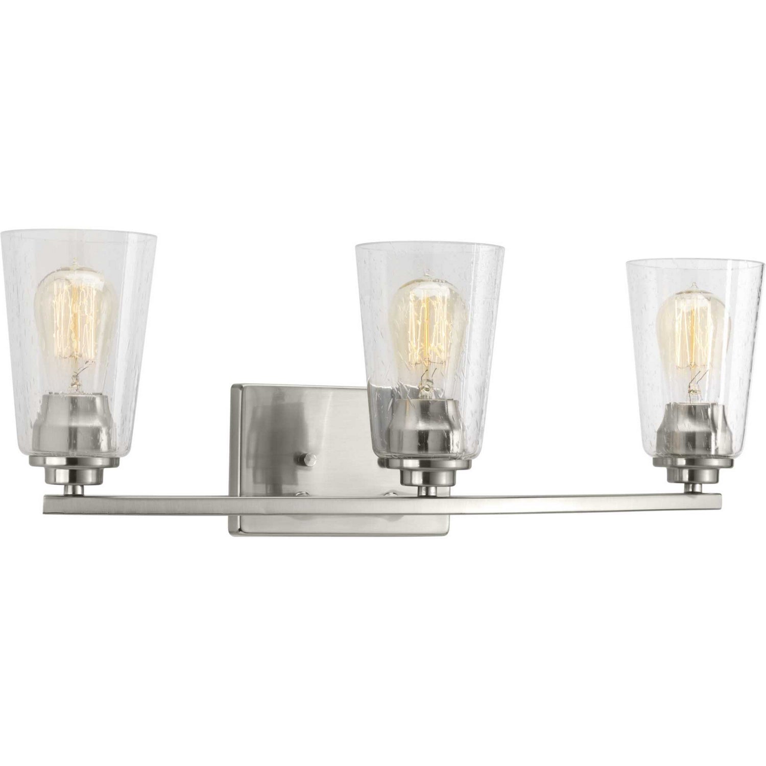 A new category of vintage modern fixtures takes center stage with this three-light bath & vanity fixture from one of our Design Series collections. Delicate details in a Brushed Nickel finish, create statement making focal pieces for a variety of interiors. Debut provides a fitting stage to feature nostalgic, vintage lamps. Glass accessory shades in clear (P860003-001) or frosted (P860002-001) seeded finishes are available.