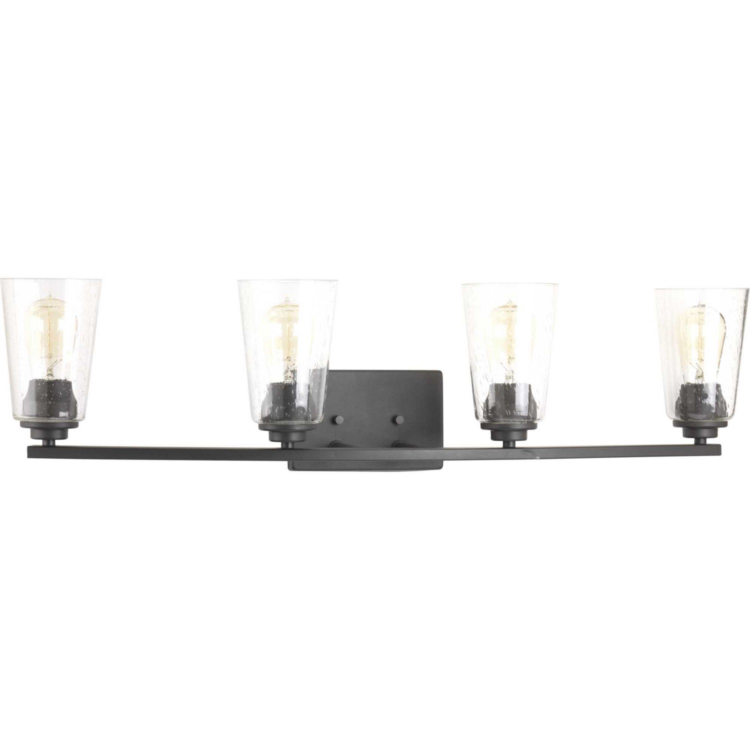 A new category of vintage modern fixtures takes center stage with this four-light bath & vanity fixture from one of our Design Series collections. Delicate details in a Graphite finish, create statement making focal pieces for a variety of interiors. Debut provides a fitting stage to feature nostalgic, vintage lamps. Glass accessory shades available in clear or frosted seeded finishes.