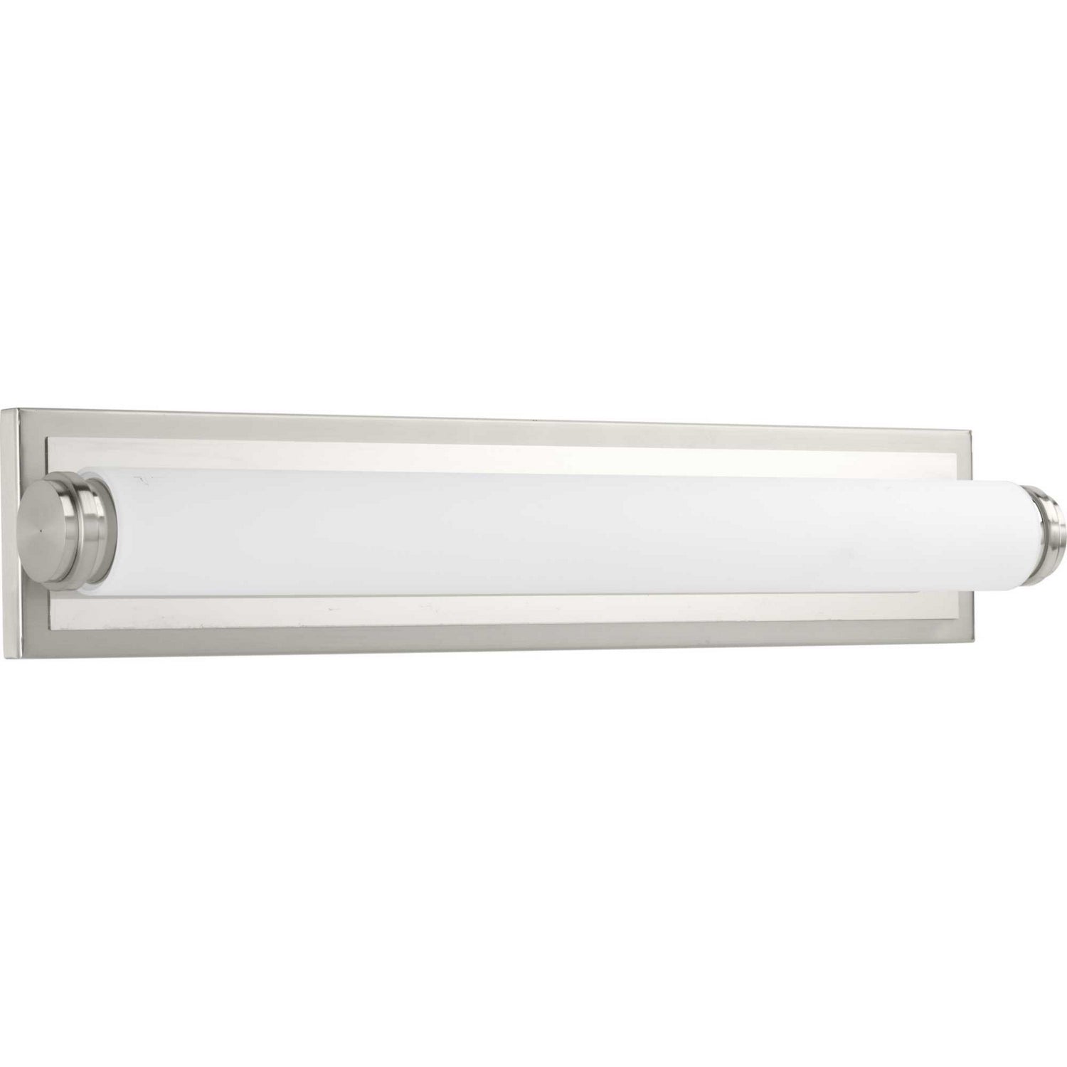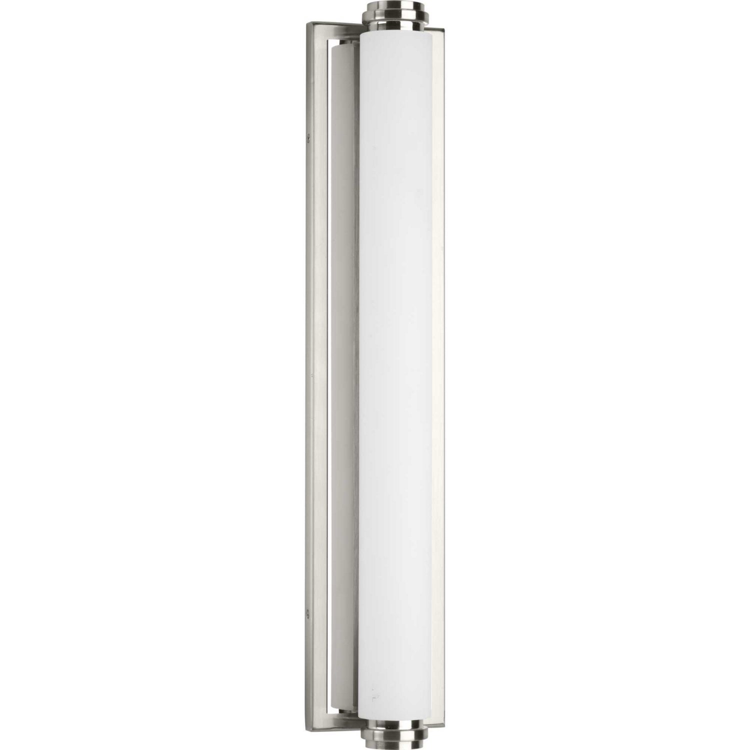 Architectural details and a full size canopy are key elements in Concourse LED vanity fixtures. A dual tone reflector frames the canopy to provide a mirror like effect. Etched opal glass is paired with Brushed Nickel and polished stainless accents in this versatile cylindrical fixture.