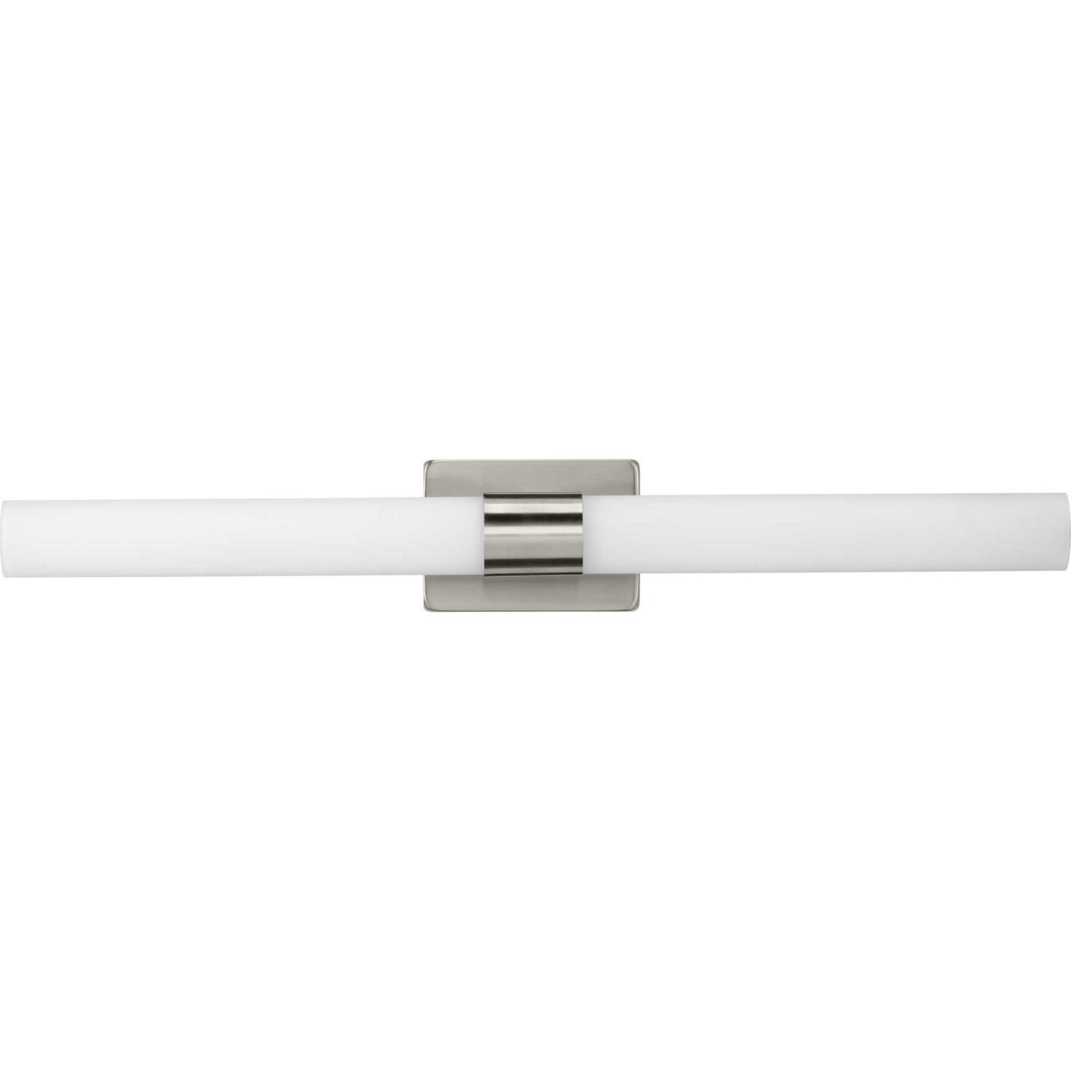 Enjoy this bath fixture`s classic forms with crisp, contemporary updates. A silky, brushed nickel finish coats a simple backplate that anchors the light fixture in place. An elegant etched white glass shade shaped in a thin cylinder stretches horizontally across the design for a clean, modern demeanor.