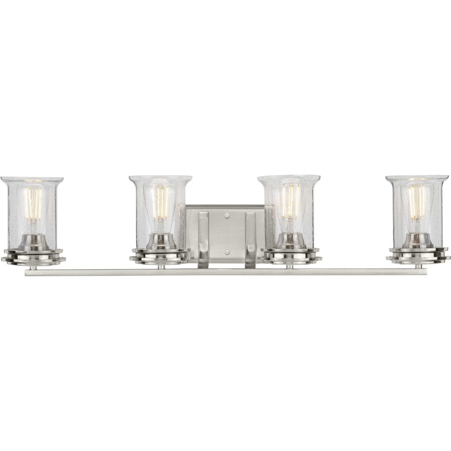 Immerse yourself in a home atmosphere primed for relaxation and inspired thinking with the beautiful craftsmanship of this bath light from the Winslett Collection. Savor this fresh take on a classic light choice as your gaze traces graceful arms and clean crisp lines coated in a beautiful brushed nickel finish. Lightly seeded glass shades rest in shiny pedestal light bases that add an unexpected, but welcomed dash of modern personality to this clean, traditional design.