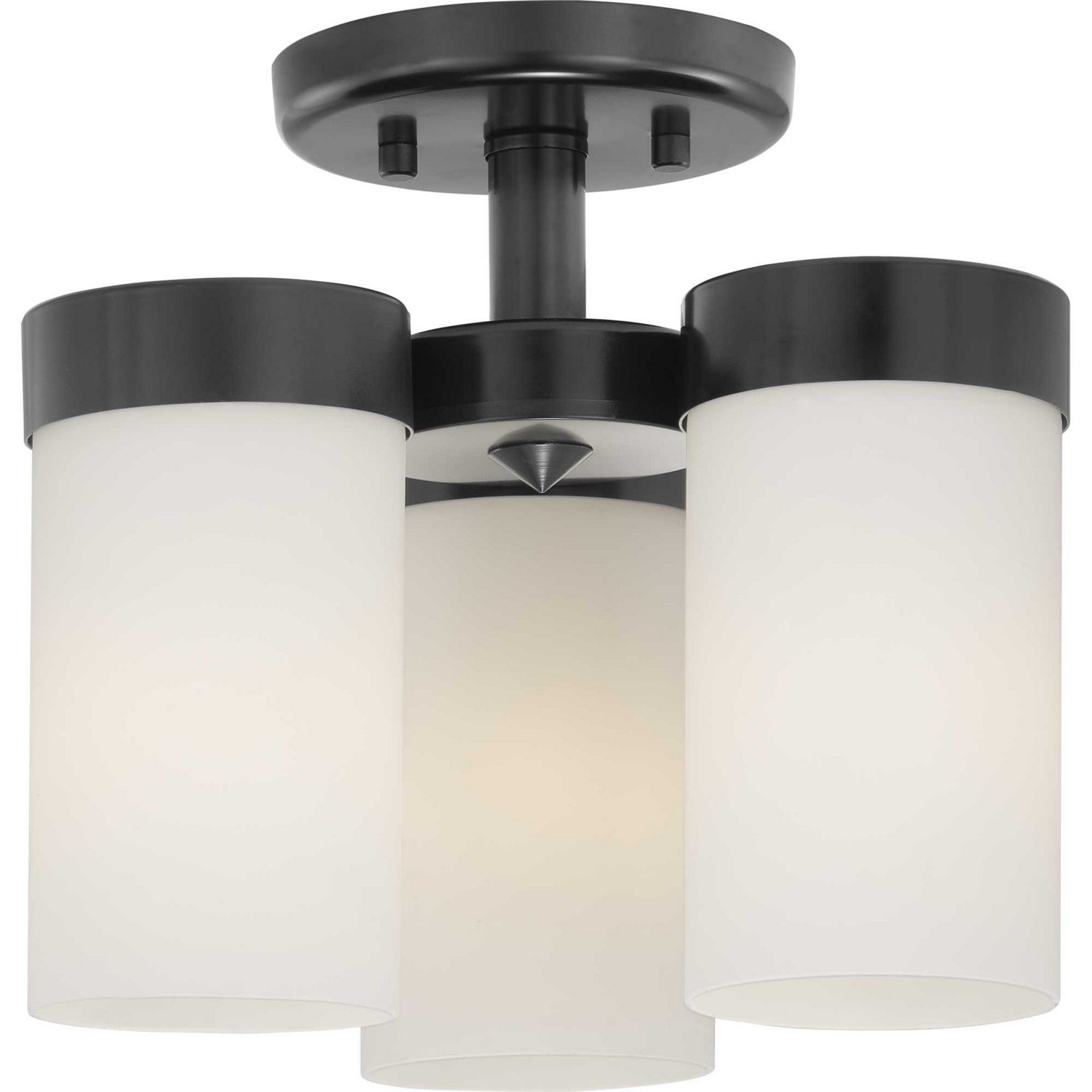 Achieve a Modern look with the Collection three-light flush mount. Etched glass white shades provide a striking contrast to the Matte Black finish. Fixtures can be installed with glass facing up or down for added customization.
