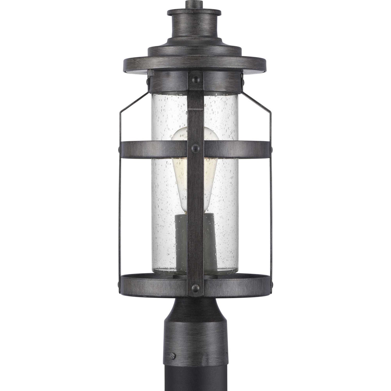 The one-light post lantern in the Collection features a design with intersecting linear details that surrounds clear seeded glass and finished in Antique Pewter. Coastal-inspired frame is suitable to complement architecture with Farmhouse flair.