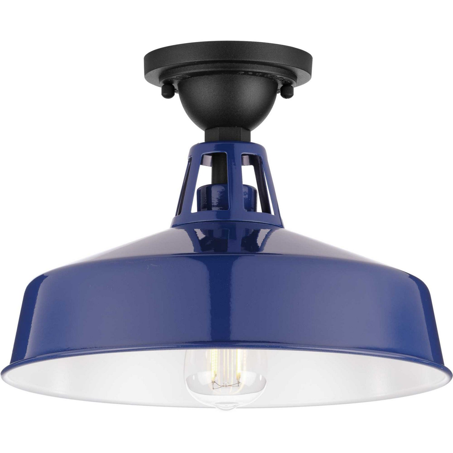 This fun take on the traditional warehouse shade provides excellent task lighting. Take in the simple metal shade coated in a gorgeous navy finish ready to direct a helpful glow. An industrial-style ceiling plate anchors the light fixture in place and adds a touch of urban flair.