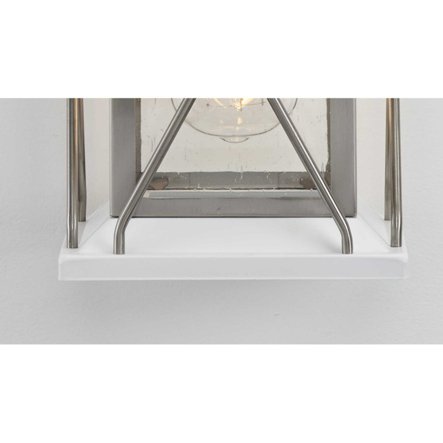 Transform you home into a warm and cozy dream with the friendly farmhouse-style of this small wall lantern. A rustic X-brace design decorates each side of the charming lantern silhouette. Clear seeded glass panes add an extra pop of rustic personality. A stainless steel finish complemented with white accents adds warmth and character as the lantern infuses your home with gentle illumination.