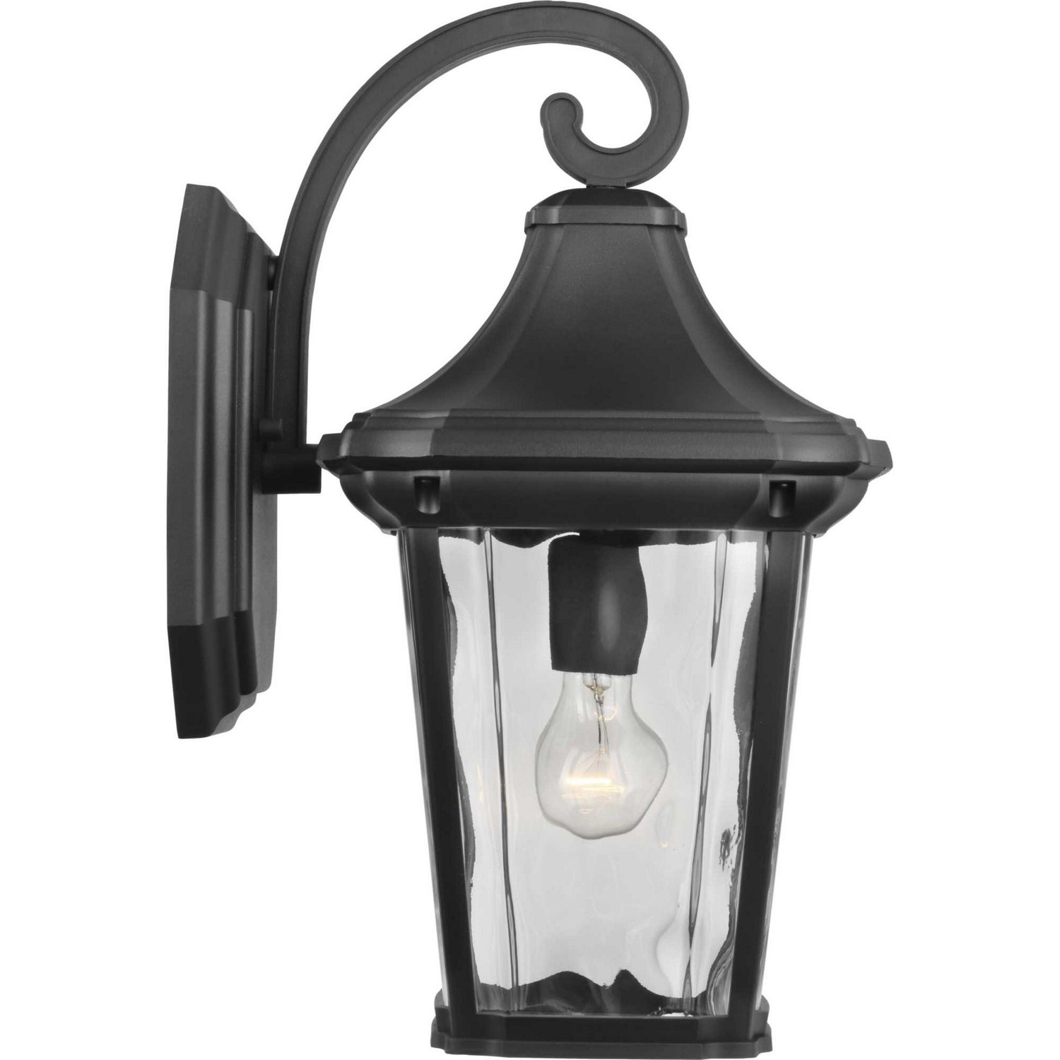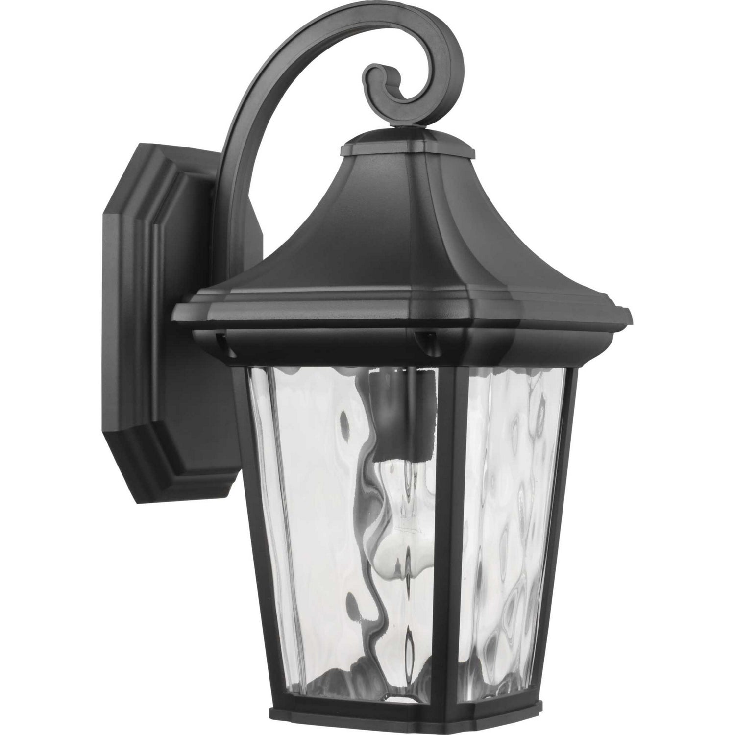 This wall lantern is a go-to choice when incorporating classic silhouettes with a farmhouse flair into your home d?cor vision. The traditional frame is constructed with non-metallic, corrosion-resistant composite polymer in a classic black finish. A beautiful water glass shade adds charming character to the timeless design. DURASHIELD by Progress Lighting is built to last. Constructed from a composite material with UV protection, DURASHIELD holds up even in the harshest weather conditions. This high-performance finish has a 5-year warranty and is resistant to rust, corrosion, and fading.