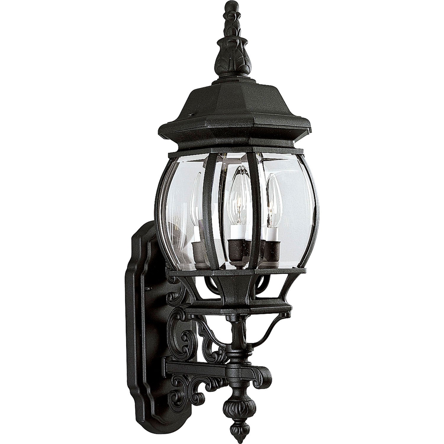 Detailed finials, end caps and scroll work in a durable power coat finish, featuring clear beveled glass panels and cast aluminum frames. Three-light wall lantern.