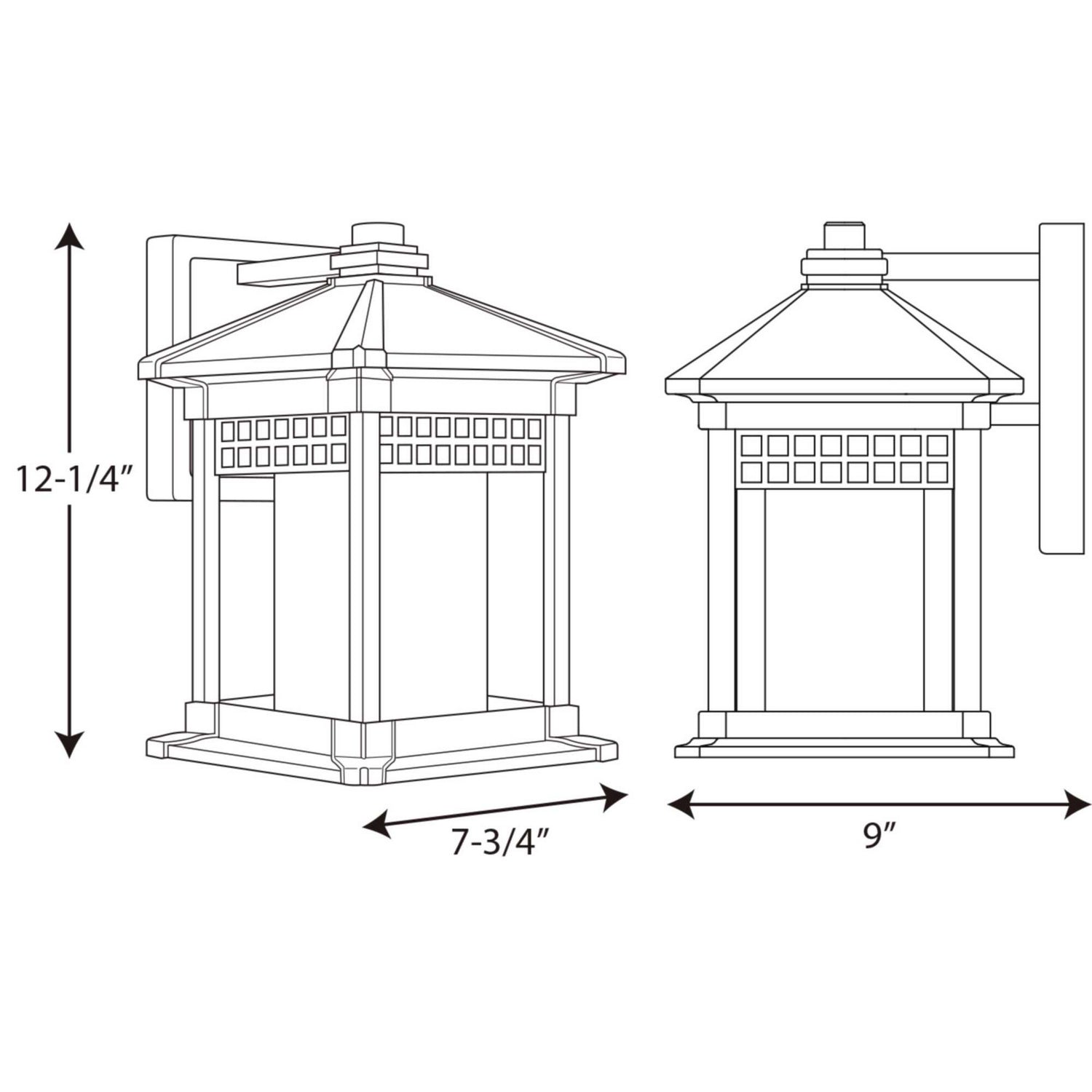 Square etched glass shade within rectilinear frame which showcases pierced grid pattern. One-light medium wall lantern in a durable powder coat finish.