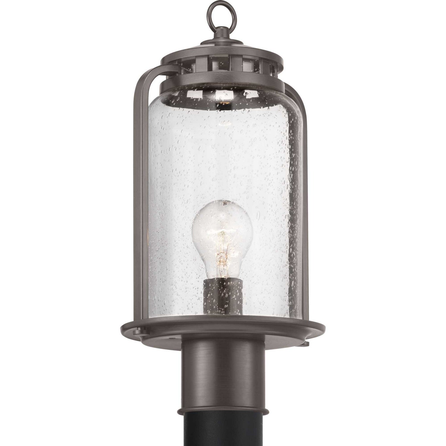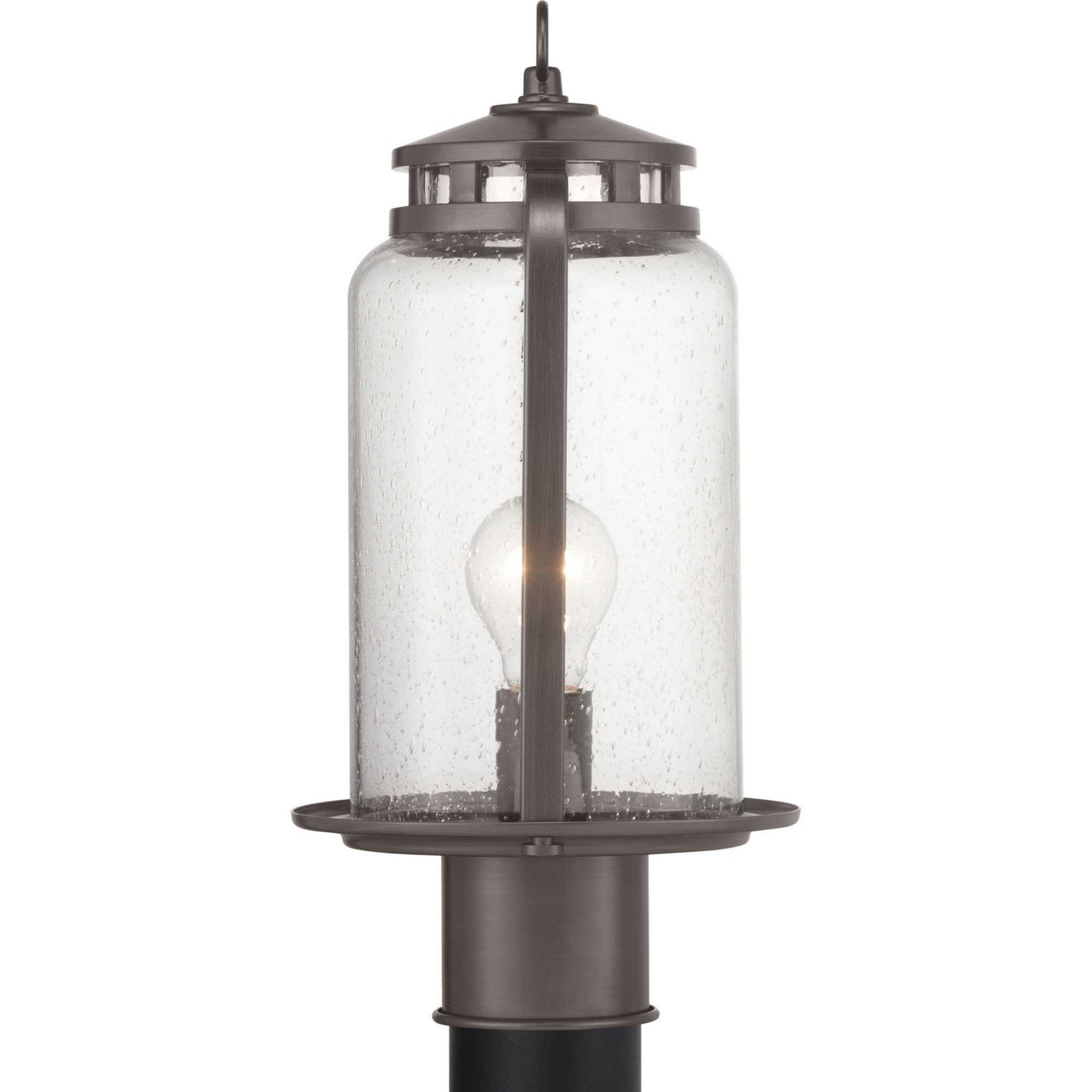 Provide a casual, rustic feel with a vintage flair to your home`s interior or exterior spaces with this post lantern. Finely crafted metal accents create a light-house inspired design with an antique bronze frame. The frame holds a clear seeded glass shade that offers extra visual character.