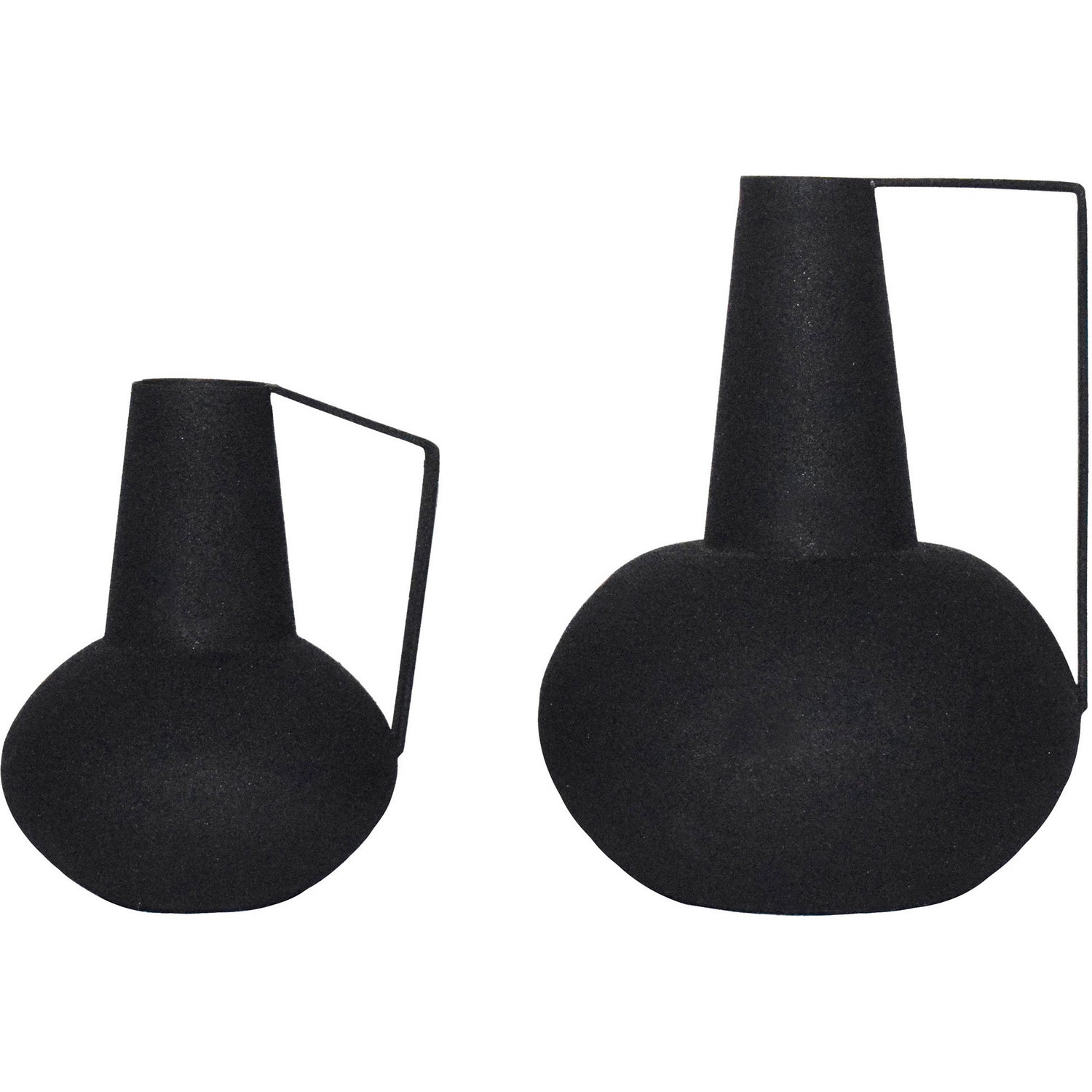 The classic pitcher style vase gets a contemporary transformation in this design. The combination of architectural angles and a textured matte black finish on powder coated iron is inherently stylish. The two vases vary in size, providing diversity for arrangements.
