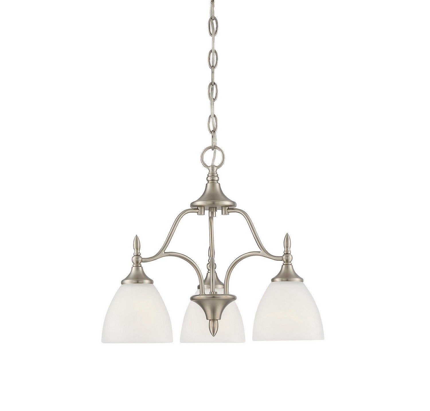 Great lighting, like the Savoy House Herndon 3-light chandelier, is a key piece of home design! Finished in timeless satin nickel, its streamlined, finely crafted details create a clean, classic design that looks terrific. The style is familiar and pleasant, which sets a serene and relaxed mood. Graceful arched light arms have white frosted glass shades and three 60W standard size bulbs provide soft, flattering light to ensure you and your guests are comfortable. This chandelier is 18.5" wide and 15" high, creating a stylish fixture with casual elegance you'll enjoy for years to come.