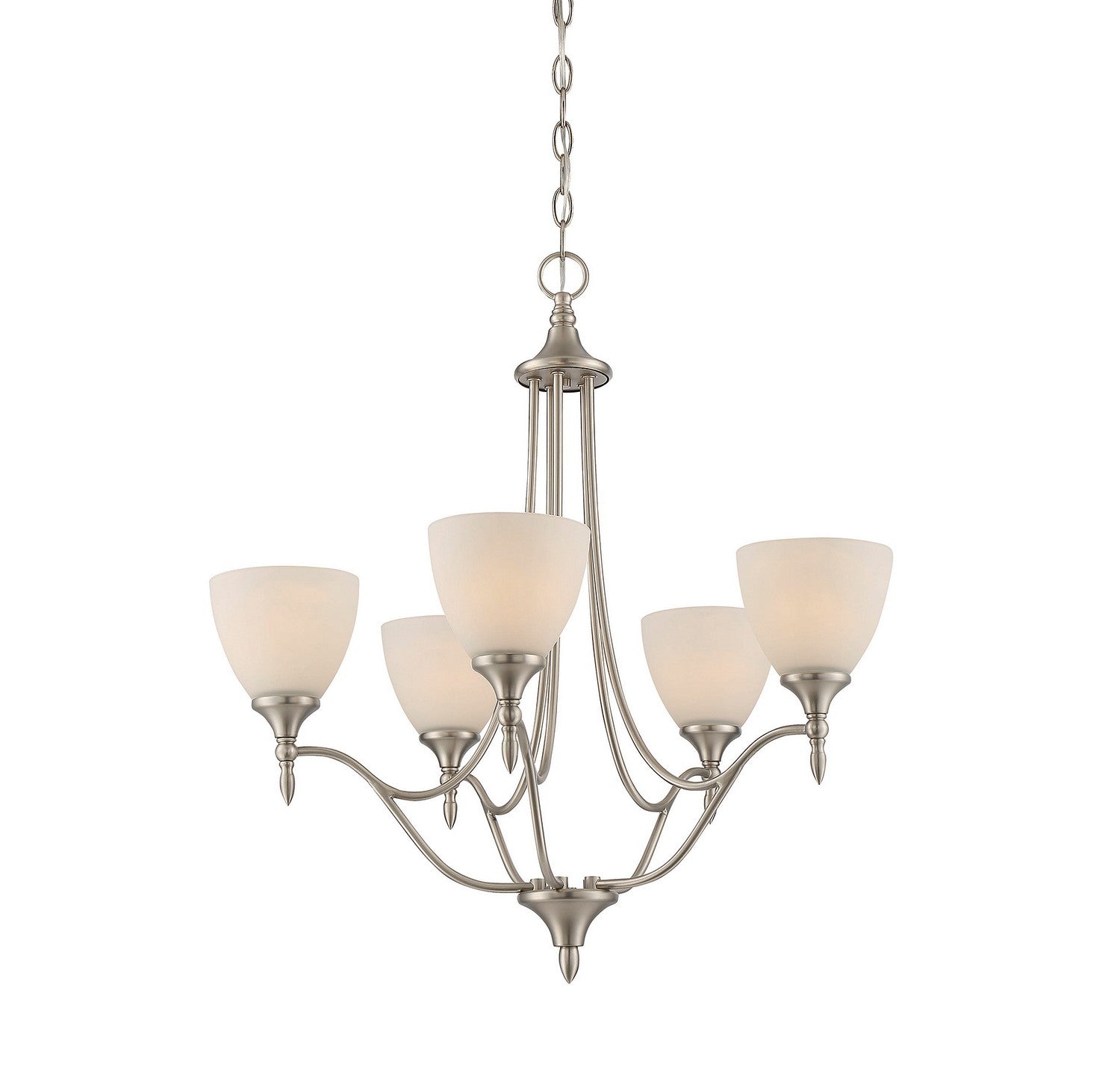 Great lighting, like the Savoy House Herndon 5-light chandelier, is a key piece of home design! Finished in timeless satin nickel, its streamlined, finely crafted details create a clean, classic design that looks terrific. The style is familiar and pleasant, which sets a serene and relaxed mood. Graceful arched light arms have white frosted glass shades and five 60W standard size bulbs provide soft, flattering light to ensure you and your guests are comfortable. This chandelier is 26" wide and 27.5" high, creating a stylish fixture with casual elegance you'll enjoy for years to come.